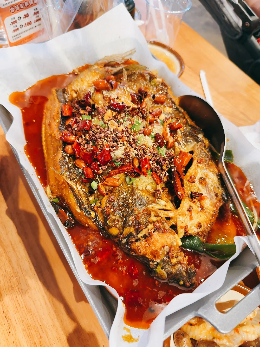 还可以点烤鱼套餐$45,正常一份烤鱼还要$40,套餐里还多了3份烤串呢!烤鱼(图3)我们点的香辣烤鱼微辣的,辣度可以接受,鱼肉很嫩,而且分量蛮大,底下还铺了一些配菜。
