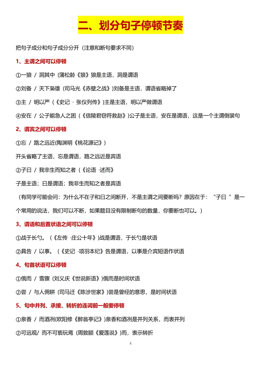 还有划分文言文句子停顿节奏的方法:主谓之间、谓宾之间、谓语和后置状语之间可以停顿。句首状语可以停顿,句中并列、承接、转折的连词前一般也要停顿。