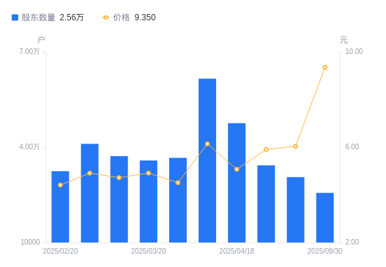 日期A股户数(户)流通A股户均持股数(股)户均持股市值(万元)2025-04-184755111995.306.082025-04-10615369269.185.692025-03-313666115558.457.022025-03-203578515939.267.832025-03-103719115336.687.242025-02-284107313887.136.822025-02-203242917588.777.762025-02-103312217220.777.992025-01-273281417382.417.672025-01-203406816742.587.58