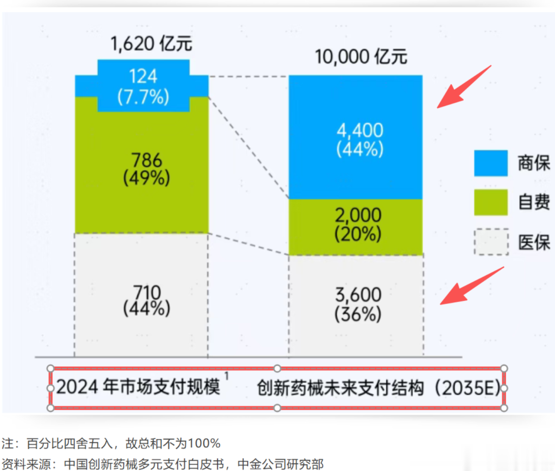 2035年的时候,医保预计买单3600亿(占比36%),这个占比相比2024年下降了,大概率因为医保收入增长速度赶不上创新药支出的增长速度。自费预计买单2000亿(占比20%),商业保险买单4400亿(占比44%)。