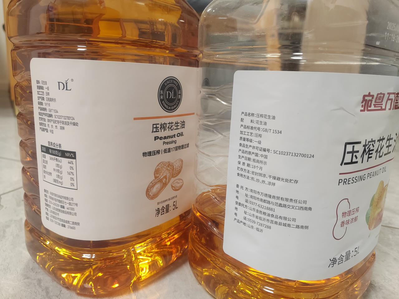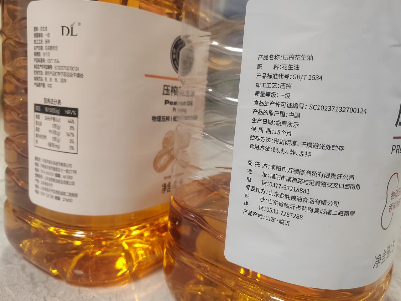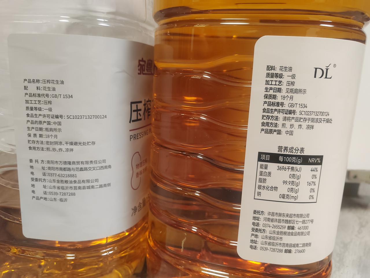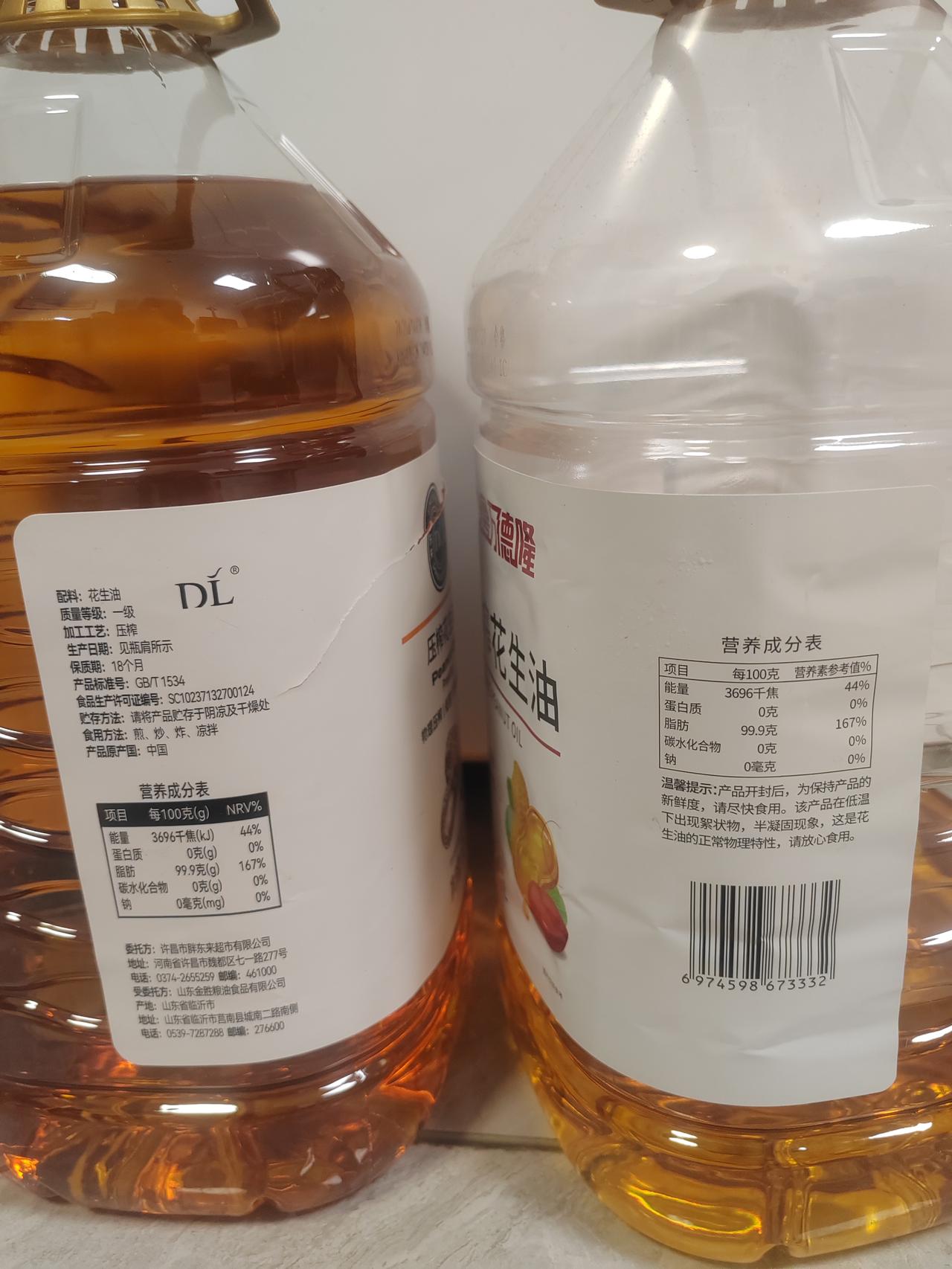 胖东来的花生油为什么会比其他超市的贵? 之前家里用的花生油一直买的是胖东来自营5L的压榨花生油,前段时间在我现在所居住的城市,有家与胖东来合作的百花生活超市缺货(这家超市卖的胖东来自营商品,与胖东来超市卖的相同产品价格是完全一样的,许昌胖东来总部曾电话回复过我,说这家超市与胖东来是合作关系),我便在万德隆超市买了一桶万德隆自营的也是5L压榨花生油,价格应该是89.8元。 今天下午从百花门口经过,便进去看看,好巧不巧,该超市经营的胖东来自营的花生油正好刚刚上架,于是我便花了97元买了一桶。 拎回家里我想看看万德隆自营的和胖东来自营的花生油有什么不同,便把剩下不多的万德隆花生油与胖东来的放到一起,这一比较可真就让人有些不淡定了。 万德隆自营的“宛粤万德隆”压榨花生油与胖东来自营的“DL压榨花生油”,竟然是同一家受委托方“山东金胜粮油食品有限公司”。两家自营的花生油容量都是5L,质量等级也都是一级,执行标准、营养成分等等全都一样,不同的就是一个是万德隆自营,价格89.8元,一个是胖东来自营,价格是97元。 完全相同的商品,为什么胖东来的价格会高出万德隆7块多钱呢? 我一直相信胖东来的货真价实,也一直认为胖东来卖的相同商品,价格不会比其他商家高。 但现在两家完全相同的商品摆在了一起,胖东来的比万德隆的要贵,这里面难道有什么原因吗,实在是搞不懂了……
