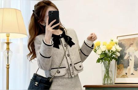 法式气质显瘦小香风套装女秋冬季名媛风减龄蝴蝶结外套半裙两件套