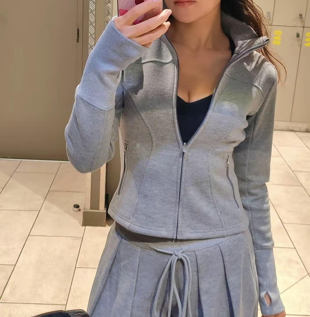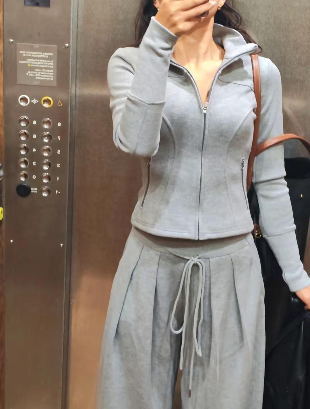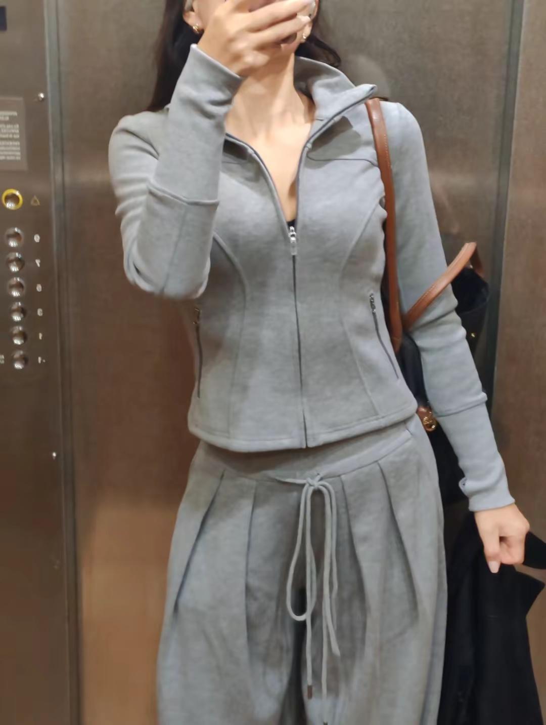 这组穿搭堪称运动风天花板!灰色短外套利落显高,蓝色瑜伽裤塑形百搭,白运动鞋轻松提