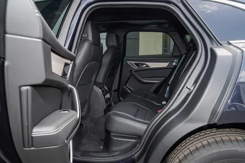F-PACE P250 的内饰走的是简约运动风,三幅式方向盘握感扎实,12.3 英寸液晶仪表 + 11.4 英寸中控屏的布局很规整,电子换挡机构很有科技感。内饰同样用了真皮材质,细节处的金属装饰点缀得恰到好处,不会显得过于浮夸。车机搭载 InControl OS 系统,支持 GPS 导航、道路救援和手机互联,虽然界面设计不算特别新潮,但功能很实用,日常通勤足够用。不过实际使用中发现,它的语音控制只支持主驾,后排乘客想调个空调还得喊主驾帮忙,不是很方便。车内配置方面,双区自动空调能满足主副驾不同温度需求,主动降噪功能有效隔绝外界噪音,营造静谧驾乘环境;可开启全景天窗让车内采光更通透,提升乘坐舒适感。此外,还可按需选配英国之宝音响系统,享受高品质听觉盛宴。