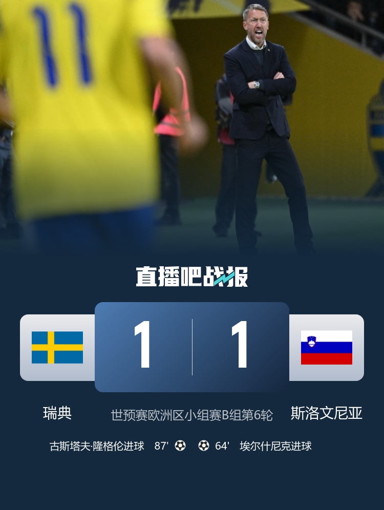 瑞典战平斯洛文尼亚,最终瑞典排名小组垫底,将凭借欧国联的保底资格进入世欧预附加赛。