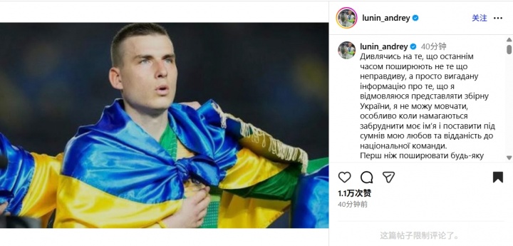 皇马门将卢宁发布社媒,对于有关自己拒绝为乌克兰出场比赛的报道进行辟谣,并称自己不可能拒绝为国家出战。