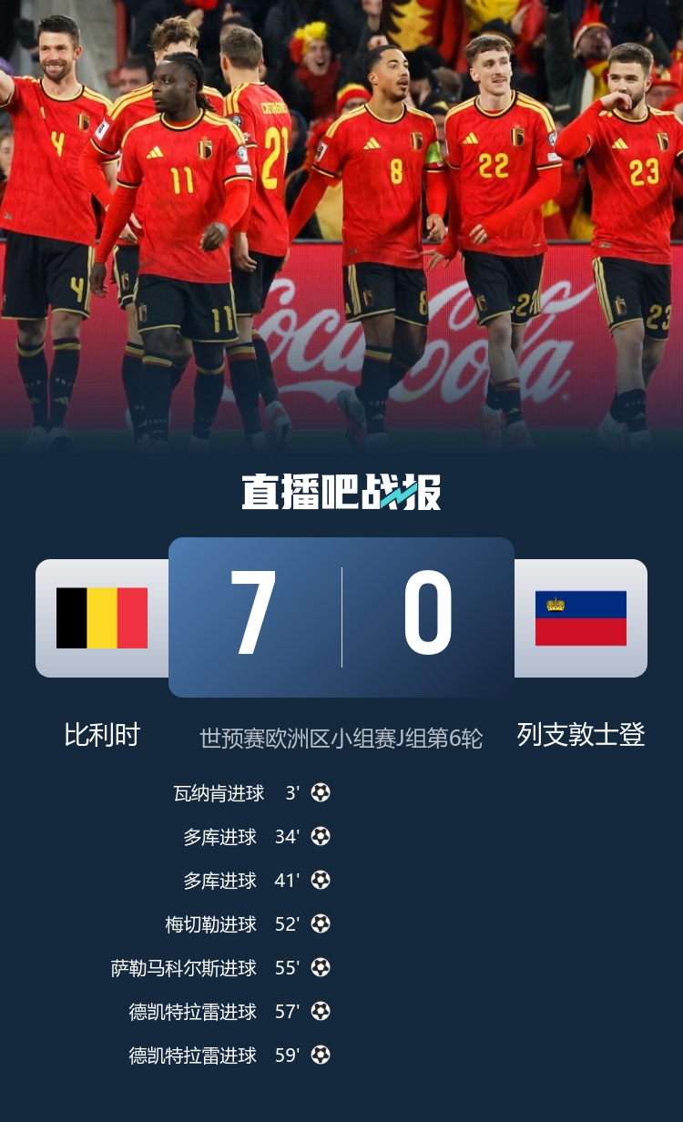 直通世界杯!比利时7-0列支敦士登多库、德凯特拉雷2射1传