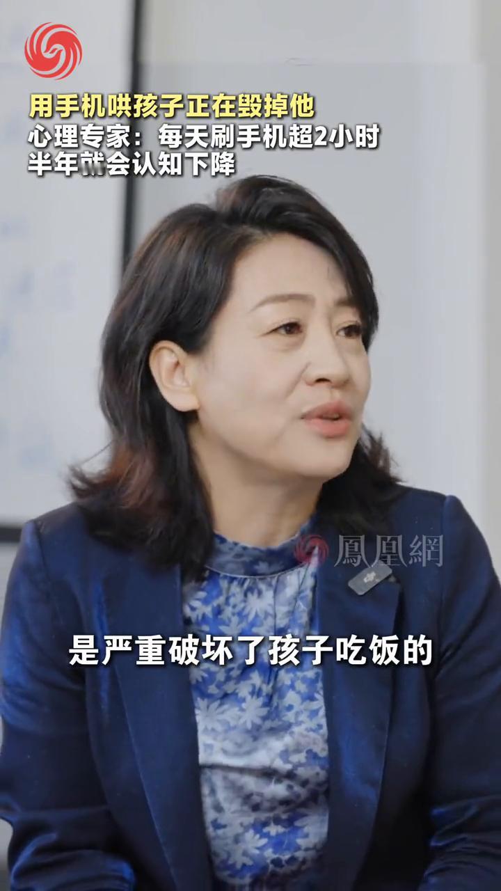 用手机哄孩子正在毁掉他。心理专家:每天刷手机超2小时,半年就会认知下降。 凤凰网主持人赵国瑞。 很多家长在吃饭的时候,在外面会给孩子放一个iPad,这是一种最简单高效的能够让他专注吃饭的。他可能只是嘴巴在动,脑子和心情一直在这个iPad上。其实这是一个最坏的方式,他机械地往下炫(饭),是严重破坏了孩子吃饭的这样一个最基本的能力。 比如在这一节车厢,可能有五六个孩子,几乎都是家长给个手机让他保持安静。但实际上,我们从儿童研究发现,如果让孩子每天超过两个小时去看这种社交媒体,超过半年以上就会发现孩子的认知能力、智力发育减缓。越是沉迷在这些电子产品,他的专注力水平下降得更厉害。 包括我们成年人,如果你很长一段时间习惯去刷视频,你会发现,你很难再集中精力去看一个稍微长一点,有深度的文章,你的深度思考能力也会受到影响。