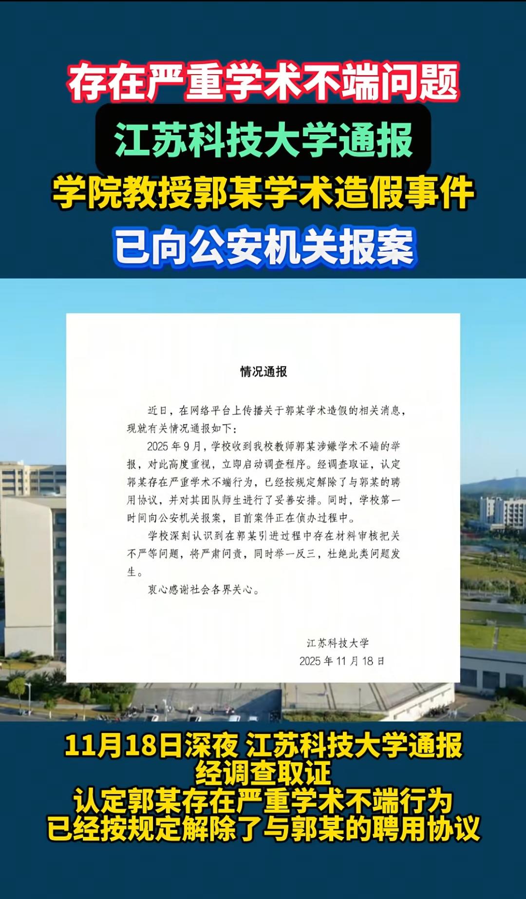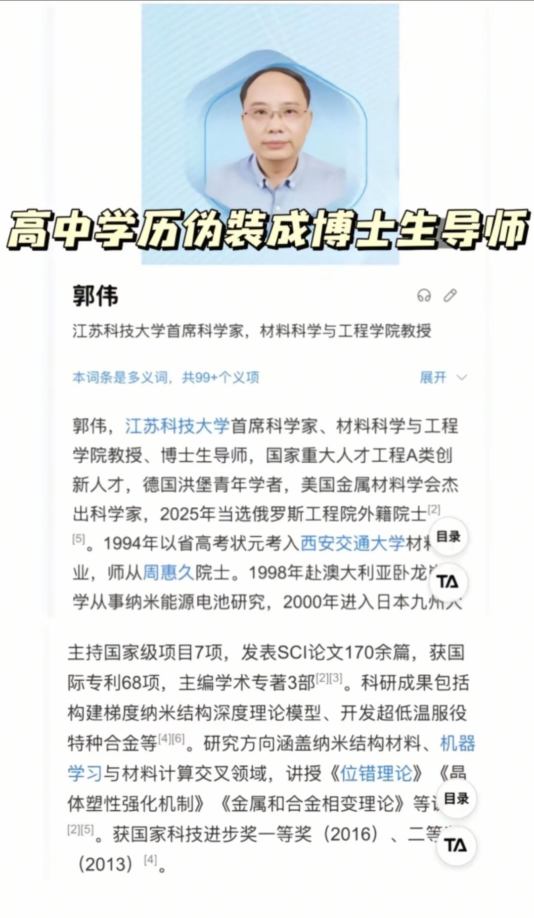 江苏科技大学一博士生导师竟然只有高中学历! 学校发布情况通报,学校已经向公安机关报案,其团队师生已经被妥善安排! 这个简直是太牛了,这个人实际的学历是高中学历,但是通过各种运作,竟然成了博士生导师。也不知道是不是水平太水的原因,最后被发现了出来。 根据网上公开的信息资料显示,这个人的头衔相当的多,俨然是一个学术大牛的姿态。 各位是怎么看的?欢迎评论区留言。