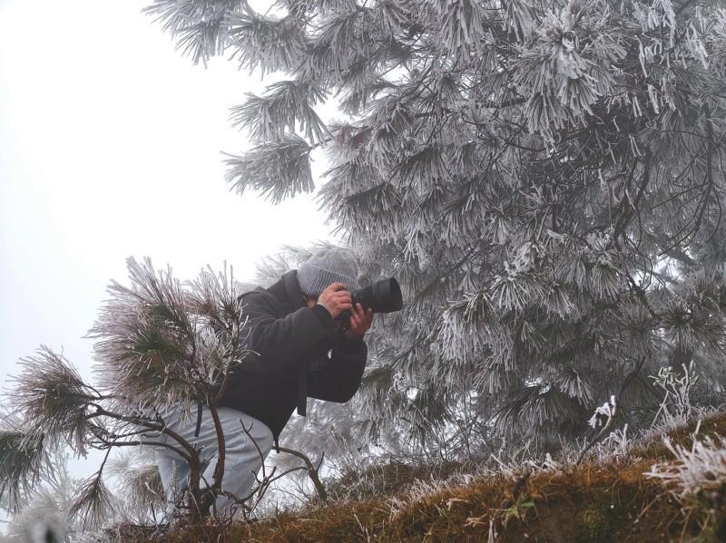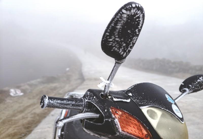 昨日,在融水苗族自治县尧告牧场,草、树及村民的车上都结了冰。通讯员梁强摄