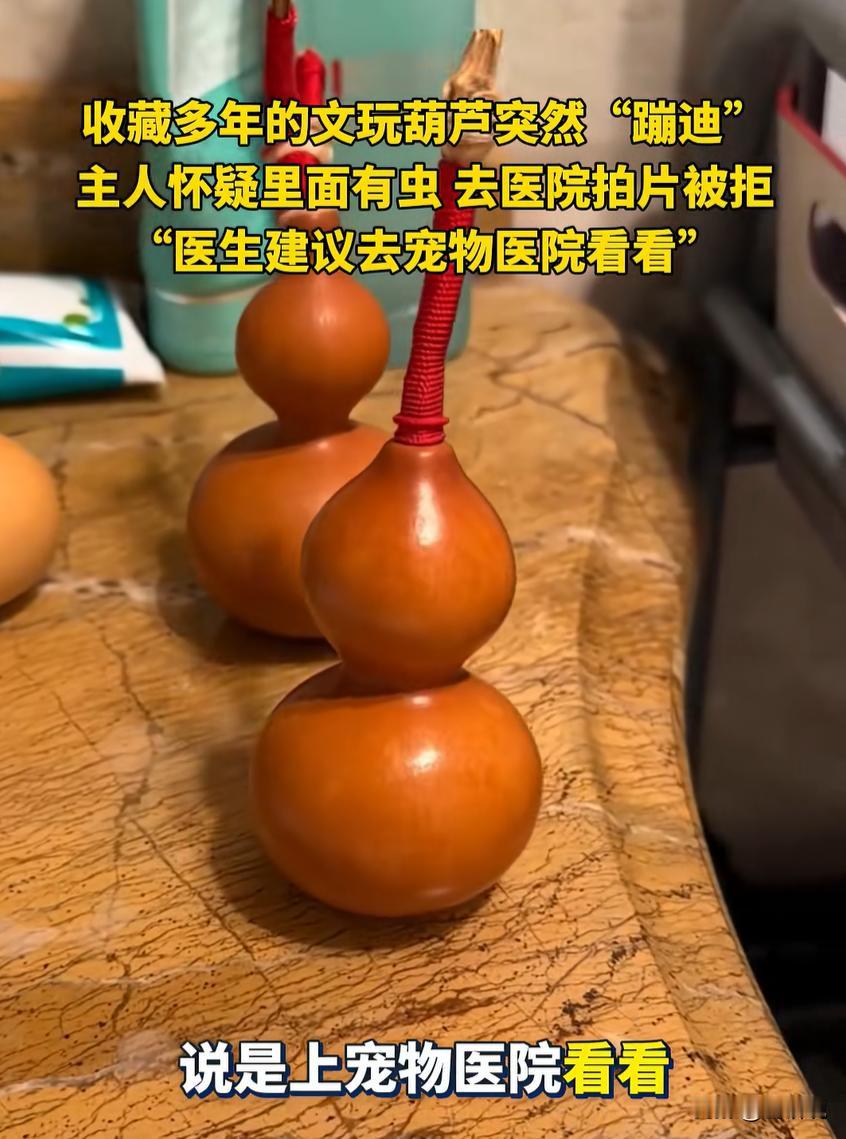 笑不活了!辽宁沈阳,一男子发现自己珍藏多年的文玩葫芦突然动了,一番找寻原因后,他怀疑里面可能是有虫子,就拿着葫芦到医院去拍片子,结果医生直接拒绝,并建议他宠物医院看看。网友:这要放走近科学节目,高低得拍3集! 马先生介绍,自己平时有个小爱好,就是收藏一些文玩,这个小葫芦之前都是放在一个盒子里面,前几天突然想着拿出来给它们放到阳台晒一晒,结果葫芦在窗台上就像是“蹦迪”一样乱动 马先生第一反应是风刮的,可换到了卫生间,葫芦依然在动,这一下让他怀疑,里面应该是有虫子了,只是去了医院后没有它想的那么顺利,没有拍到片子 他把视频传到网上后,网友们也是纷纷调侃起来 有网友说:你凑近听听,里面可能一直在喊:爷爷、爷爷、爷爷 还有网友表示:这还去啥医院,你直接到地铁站看看得了 不得不说,这些评论确实挺逗,但也能看出来大家对这种事是真好奇,其实理性分析一下,文玩本来就是跟自然打交道的东西,只要不是人为破坏,就可能出现各种小状况 葫芦内部干燥不彻底或者有残留组织,确实会吸引虫子钻进去。虫子活动时,如果空间够大,外壳又比较轻,摆动完全有可能出现 另外,文玩葫芦在制作过程中,如果处理不当,也可能藏有虫卵。在适宜的温度和湿度条件下,这些虫卵就会孵化成活虫 所以说,收藏文玩不仅要注重品相,更要做好清洁和防虫处理