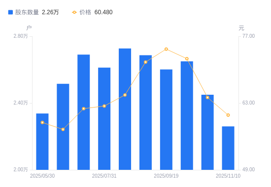 日期A股户数(户)流通A股户均持股数(股)户均持股市值(万元)2025-11-10226052836.6017.162025-10-20244992617.3116.802025-09-30264982419.8617.502025-09-19260172464.6018.322025-09-10268712386.2717.092025-08-08272732351.1015.212025-07-31261242454.5015.312025-06-30269072383.0814.732025-06-20251542549.1514.652025-05-30233732743.4016.17