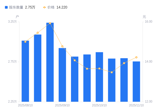 日期A股户数(户)流通A股户均持股数(股)户均持股市值(万元)2025-11-102753913301.3818.912025-10-312793813111.4118.262025-10-202789213133.0417.692025-10-102869212766.8617.442025-09-302840712894.9417.602025-09-192813913017.7618.322025-09-102921212539.6018.522025-08-313238311311.7018.022025-08-203090411853.0518.312025-08-103014212152.7018.23
