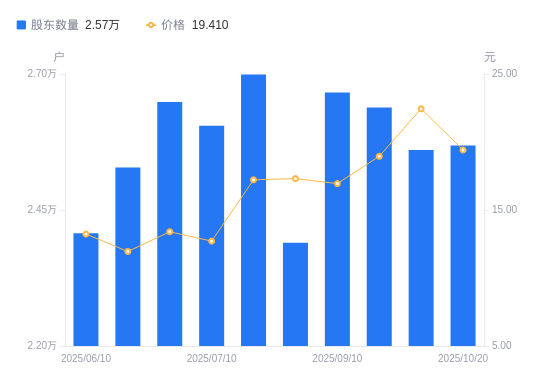 日期A股户数(户)流通A股户均持股数(股)户均持股市值(万元)2025-10-202568417454.6133.882025-09-302560317509.8339.292025-09-192638517065.1332.342025-09-102666216887.8428.612025-08-082389718841.8432.622025-07-312698916683.2228.732025-07-102605117283.9221.972025-06-302648417001.3422.782025-06-202527917811.7621.292025-06-102407218704.8624.75