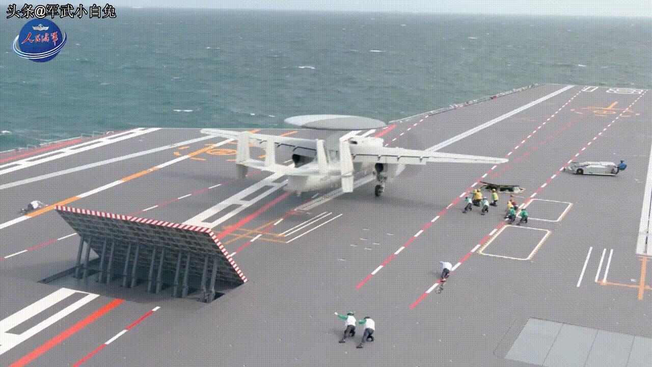 两架KJ600预警机准备在“福建”舰2、3号弹射器起飞。