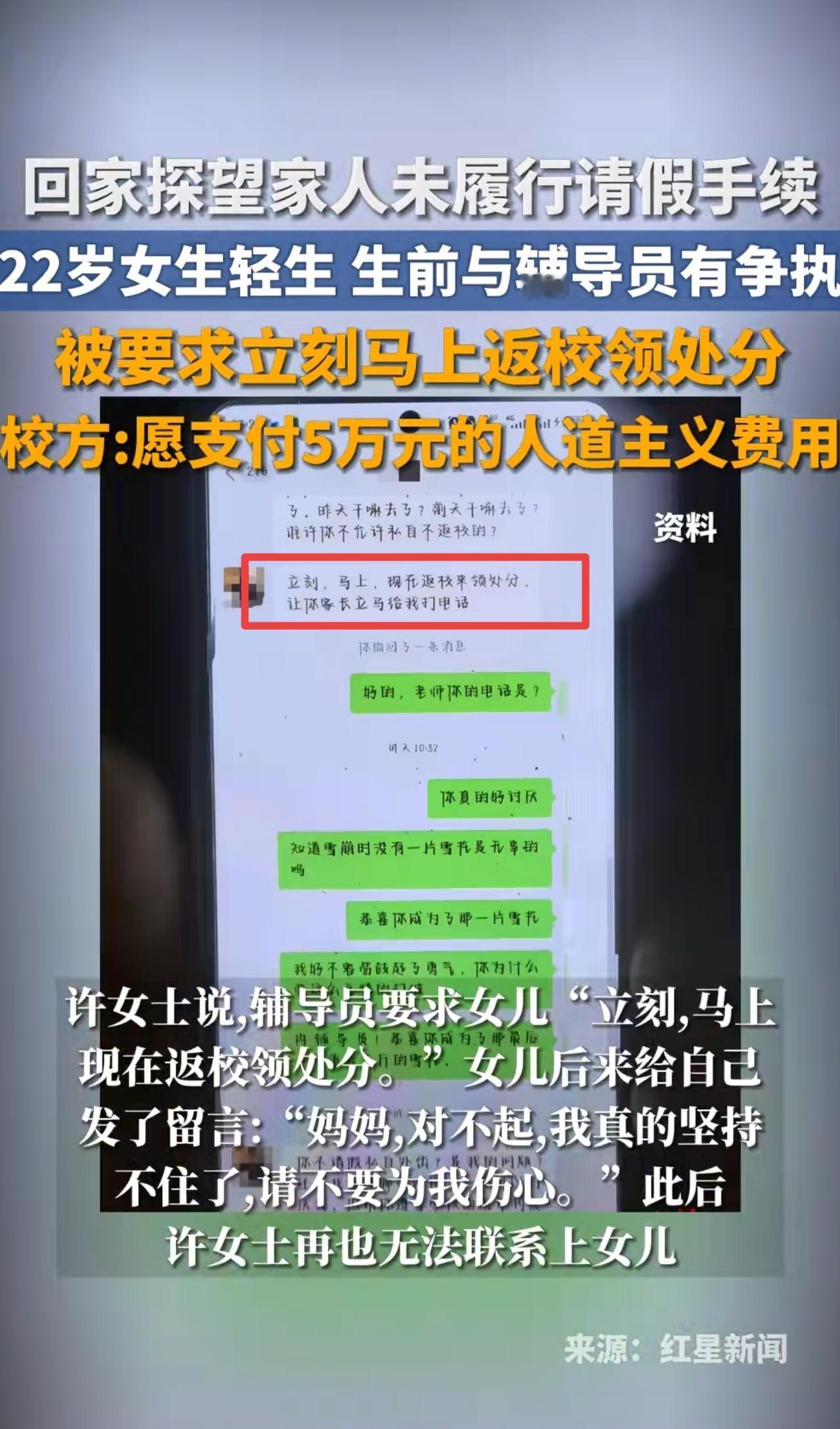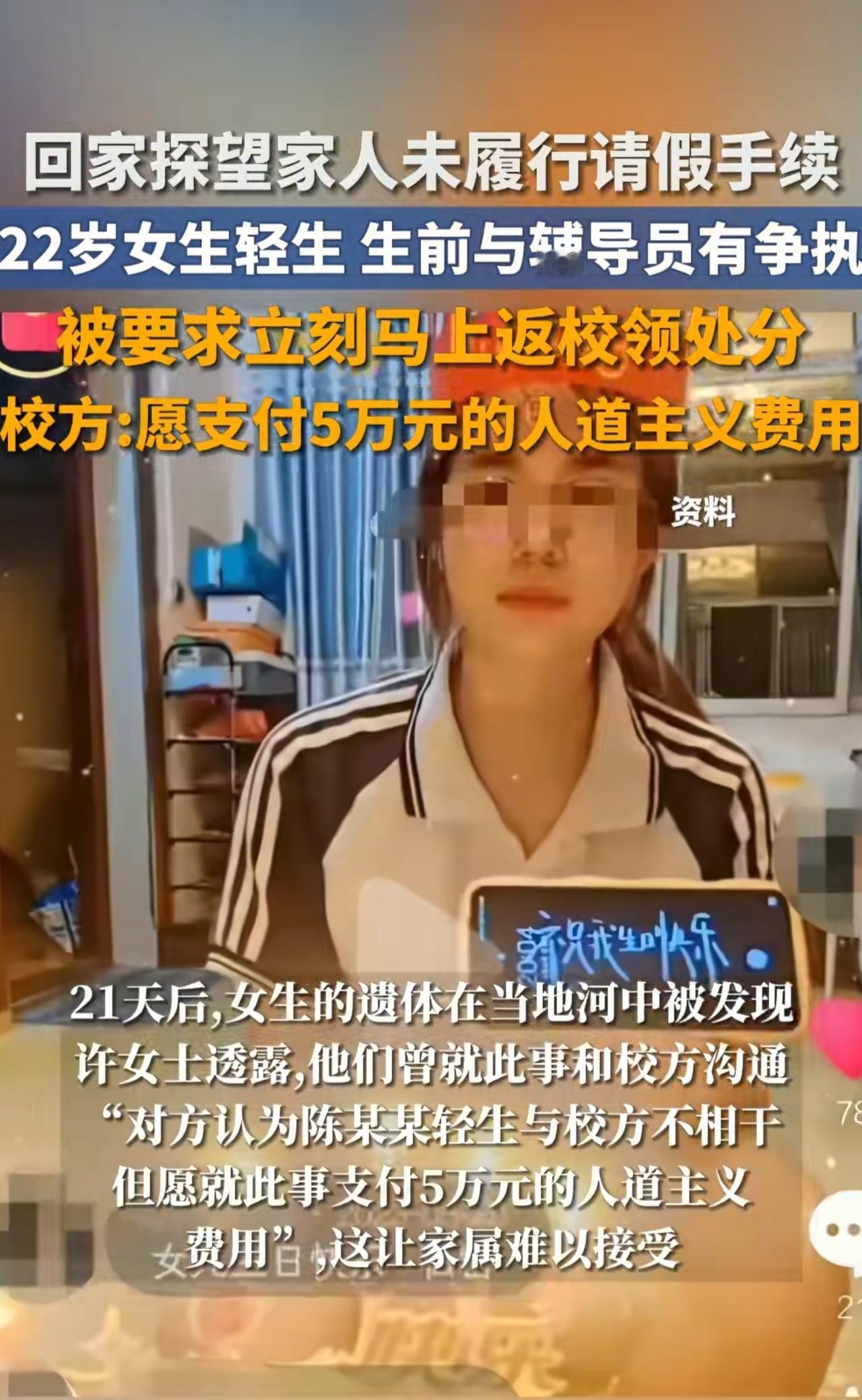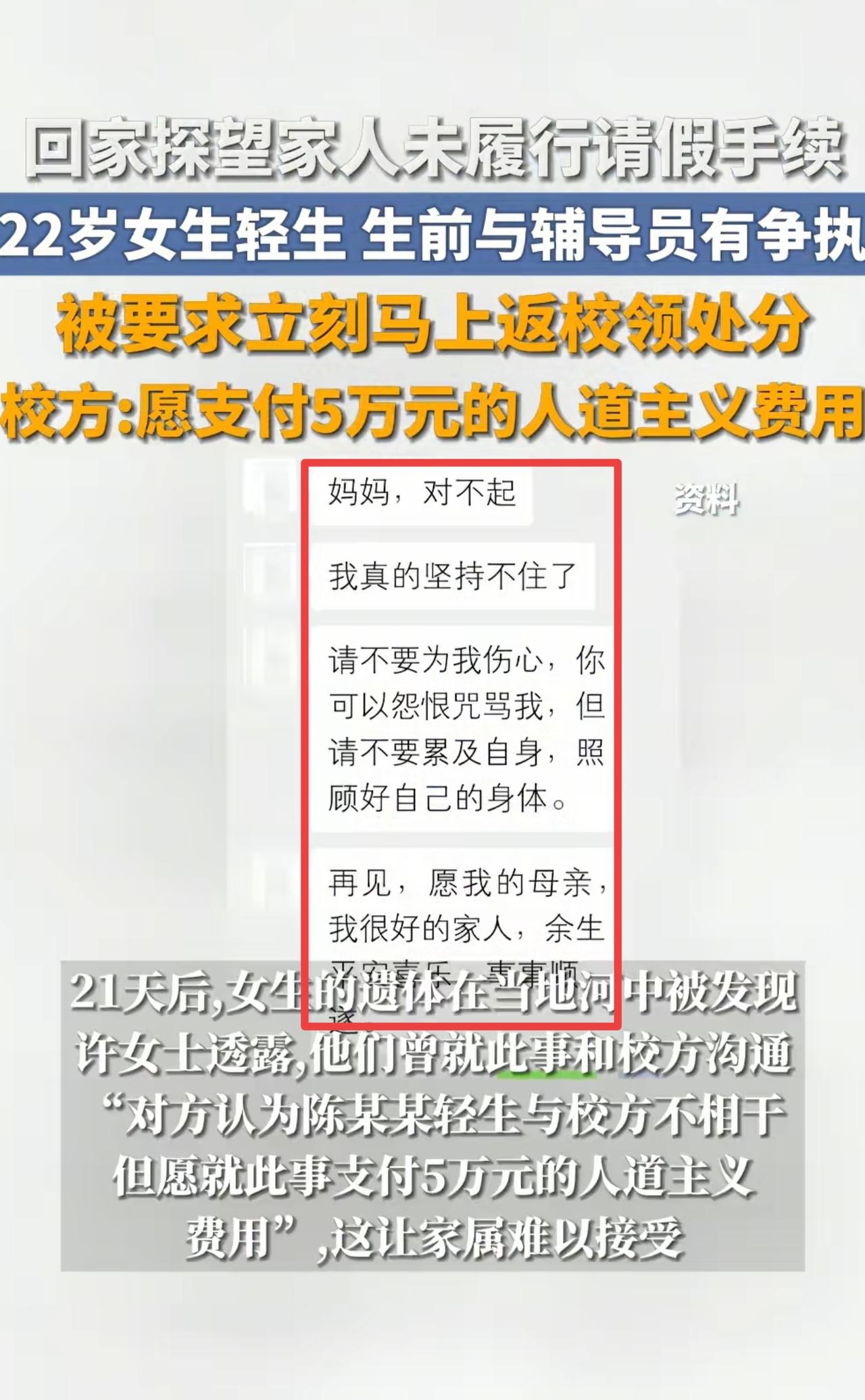 “雪崩的时候没有一片雪花是无辜的”,当女孩说出这句话的时候,内心是多么的无助和失望啊! 近日,西安培华学院一名22岁的大四女生跳河轻生,生前曾因未履行请假手续外出看望母亲而被导员责怪,随后两人在聊天过程中发生争执,女孩在返校途中跳入当地的一条河流中轻生。 据了解,西安培华学院是当地的一所民办本科院校,校园内日常管理比较严格,校内设有门禁,除了周末外,只有周三的时候学生才能外出,而且下午的时候还要在宿舍内定位打卡,确保你没有离开学校。 本来两个人好好沟通交流,回去后把请假条补上就行了,偏偏辅导员也是个急性子,说话那么直接。辅导员的责备成了压倒女孩的最后一根稻草,就因为一次没有请假的外出,导员就直言:“立刻、马上,现在回来接受处分”,要知道,女孩今年已经大四了,一旦受到校内处分的话,是无法消除的,甚至还有可能被延毕。重重压力之下,女孩最终选择了轻生。 女孩在跳河之前,给母亲的遗言中说到:“妈妈对不起,我真的坚持不住了,请不要为我伤心”。在女孩跳河后的第21天,遗体在当地的河中被发现,母亲悲痛万分,学校给与学生家属5万块钱的人道主义费用,家属表示难以接受。 一条鲜活的生命,就这样离开了我们,也许当初辅导员态度好一点,说话语气温和一点,可能就不会发生这样的事情了。
