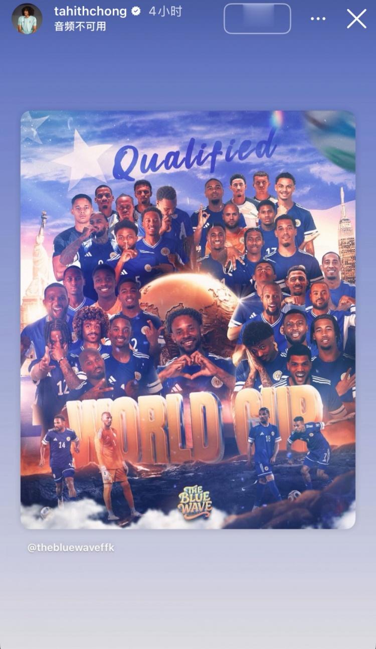 25岁华裔球员陈达毅在比赛结束后更新社媒,晒出了库拉索晋级世界杯的庆祝海报。