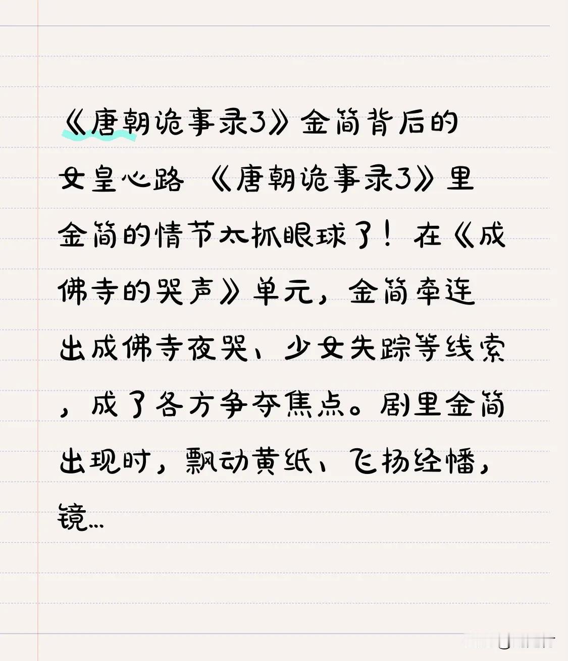 《唐朝诡事录3》金简背后的女皇心路 《唐朝诡事录3》:金简背后的女皇心路 《唐朝诡事录3》中,金简情节十分吸睛。在《成佛寺的哭声》单元,金简牵出成佛寺夜哭、少女失踪等线索,成为各方争夺焦点。剧里金简出现时,黄纸飘动、经幡飞扬,镜头绝美,弹幕满是“内娱悬疑细糠来了”。 现实中,武则天金简也有故事。1982年,河南登封一农民采药时发现它。金简长36.2厘米,含金量90%,刻有63字铭文,含5个武则天自创的字。剧里苏无名称金简从嵩山峻极峰投下,与后世发现相符。武则天一生八次前往嵩山,晚年还暗地行事,金简背后的女皇心路,着实引人好奇! 唐诡之长安 唐朝诡事录