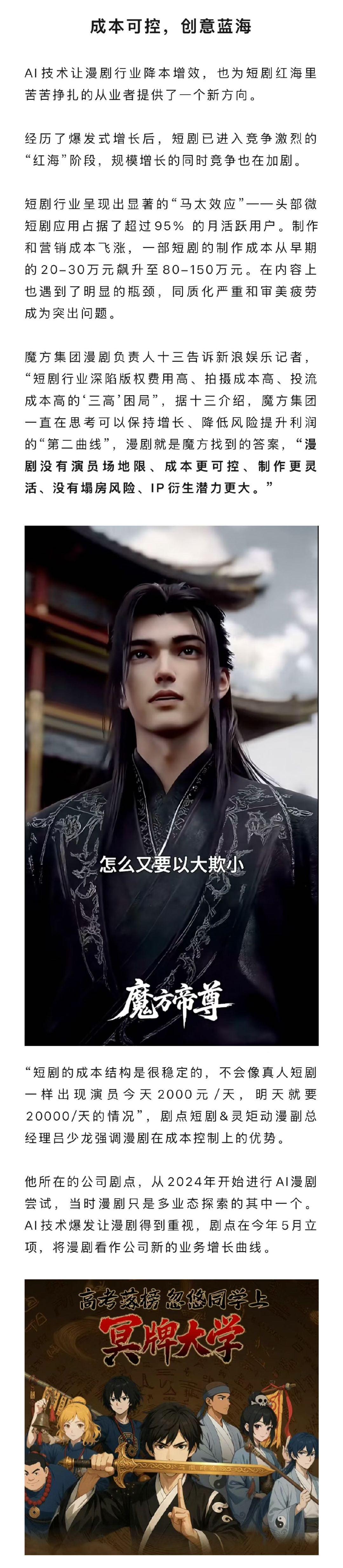漫剧是将静态漫画、小说文本等原始素材转化为动态的非真人视频短剧。Ta并不是一个全新的内容形态,很长一段时间,它都以“动画与漫画的中间形态”存在于短视频平台。但随着AI技术迭代更新,漫剧从简单的动态漫、沙雕漫逐渐进化到AIGC短剧。
