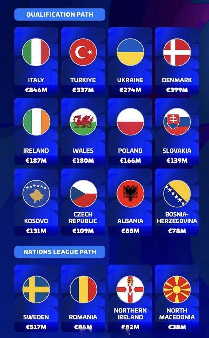 【附加赛:意大利全队身价领跑】16支参加世预赛欧洲区附加索帅的国家队,全队球员转会身价总和排行:意大利8.46亿欧元、瑞典5.17亿欧元、丹麦3.99亿欧元,位居前三,倒数第一是只有3800万欧元的北马其顿。