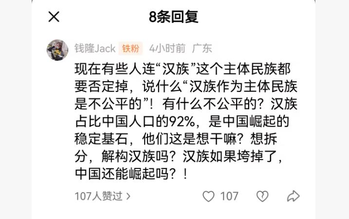 是的,这兄弟说的太对了,说我心坎了。 我今天写这个头条,就是朋友推给我一个视频,我一看,一个大V在那里胡说八道,说汉族作为主体民族对其它民族不公平,劳资看的真的差点血管都爆了,我就想问这样的乱臣贼子: 你踏马的说汉族作为主体民族是不公平的,你认为谁做公平?谁做公平????? 其实我知道这帮××是天天想着梦回大清,这帮人就是天天想做包衣,想找个主子下跪,想得发疯。 我再重申两个原则: 1、中华民族是血脉相连,绝对不可分割的整体,这是我们最坚固的第一认同!是无上荣耀,但认同是相互的,你要高度认可这个身份,我们才是一起的,你不能半边来往。 2,各民族完全平等,主体民族稳定性绝对不可动摇!!!这是国家稳定的基石!!!!