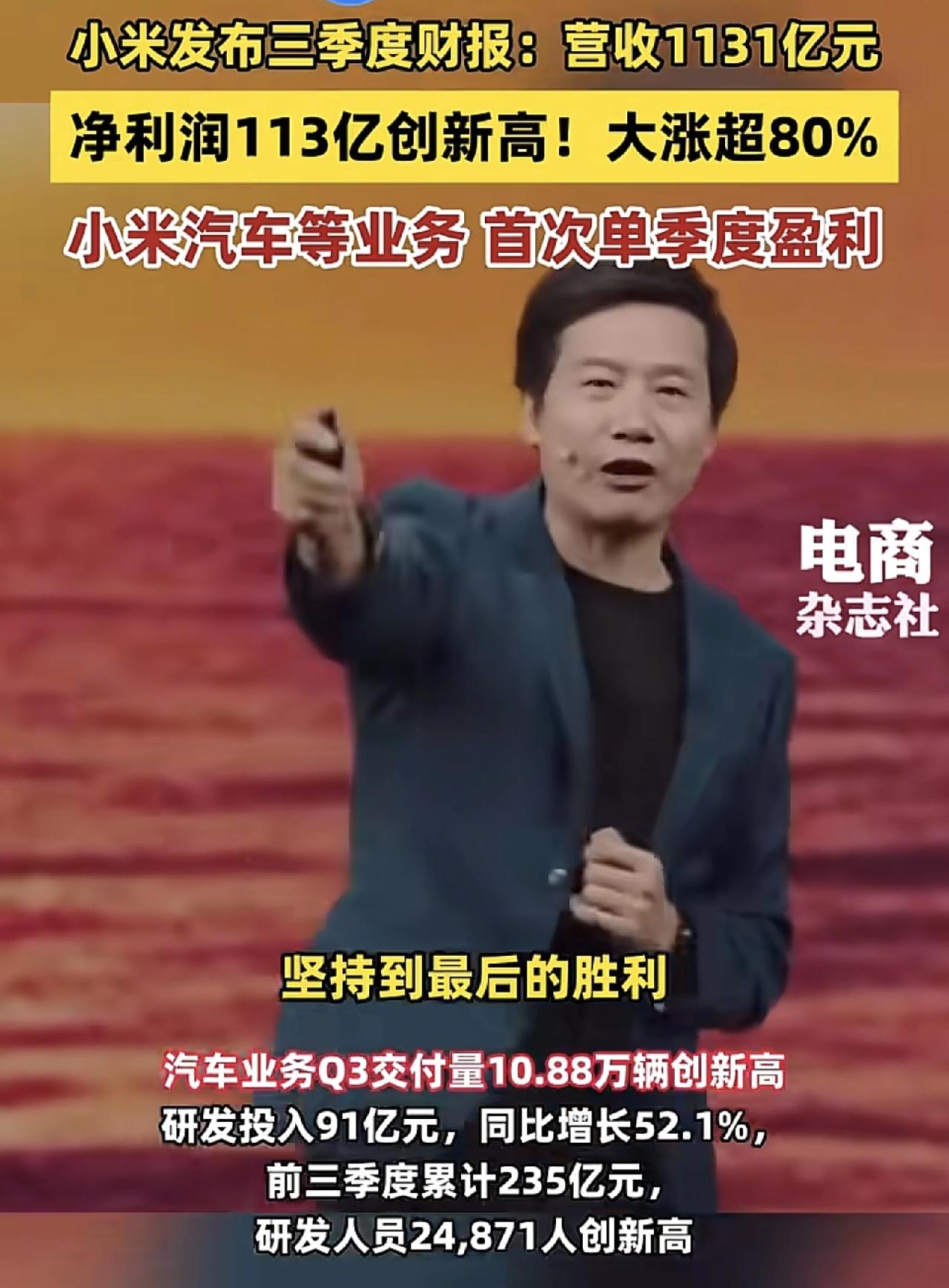 炸裂!小米三季度财报出炉,营收破千亿,雷军要放大招? 家人们,今天有个超重磅的消息!小米刚刚发布了三季度财报,各项数据简直亮瞎眼!营收高达1131亿元,净利润也达到了113亿元,这成绩简直逆天了!小米这是要在科技界一路狂飙啊! 营收破千亿,小米实力大揭秘 先来看营收数据,1131亿元的营收规模,这可不是随便哪个企业都能做到的。小米在智能手机、智能家居、智能电动汽车等多个领域全面开花,各个业务板块都为营收增长做出了重要贡献。 在智能手机方面,小米凭借着高性价比的产品策略和不断创新的技术,赢得了广大消费者的喜爱。特别是小米14系列手机,一经推出就受到了市场的热烈追捧,销量一路飙升。同时,小米还在海外市场取得了不俗的成绩,进一步扩大了市场份额。