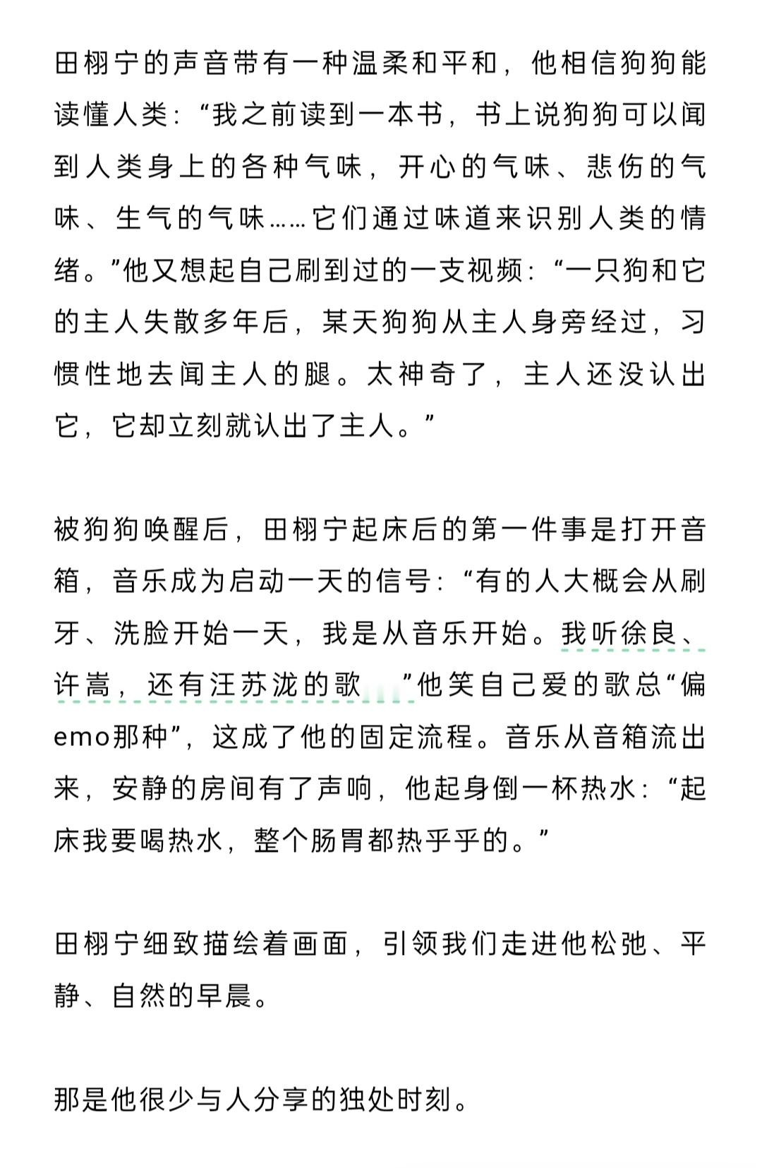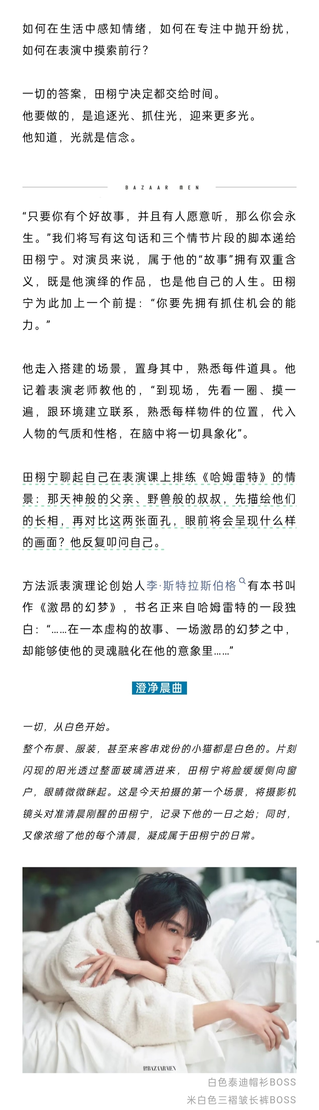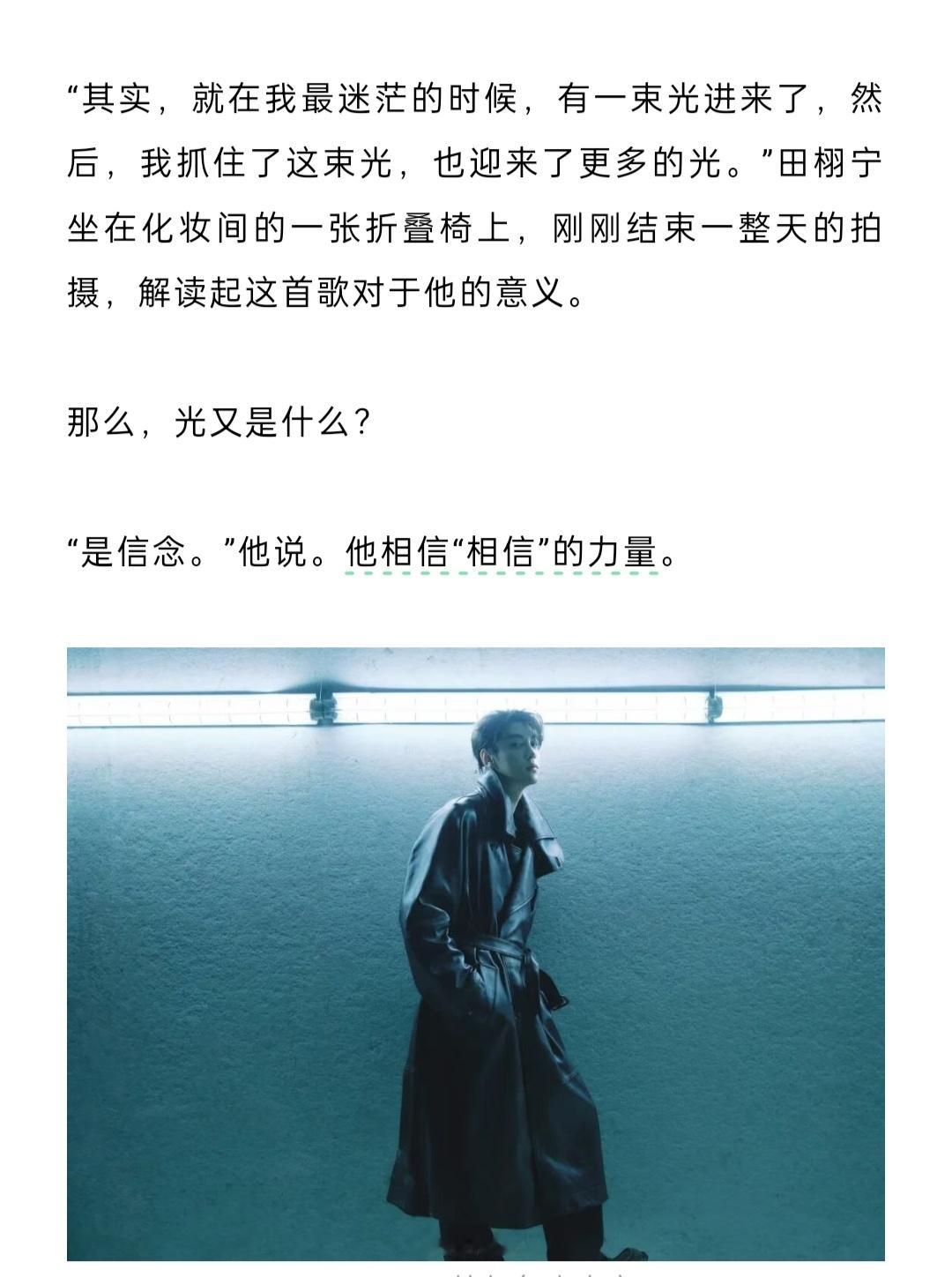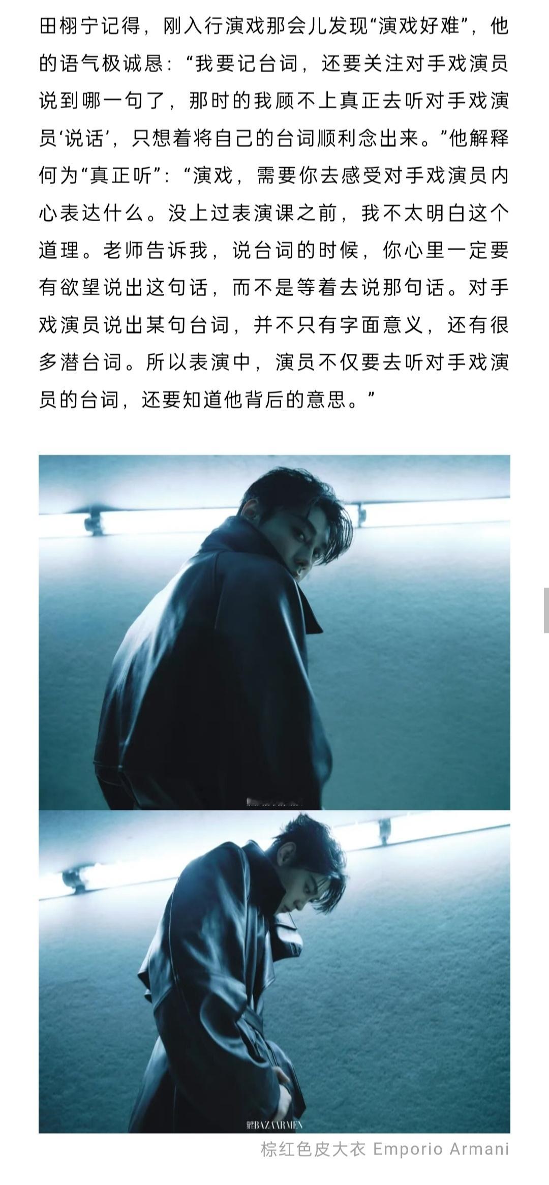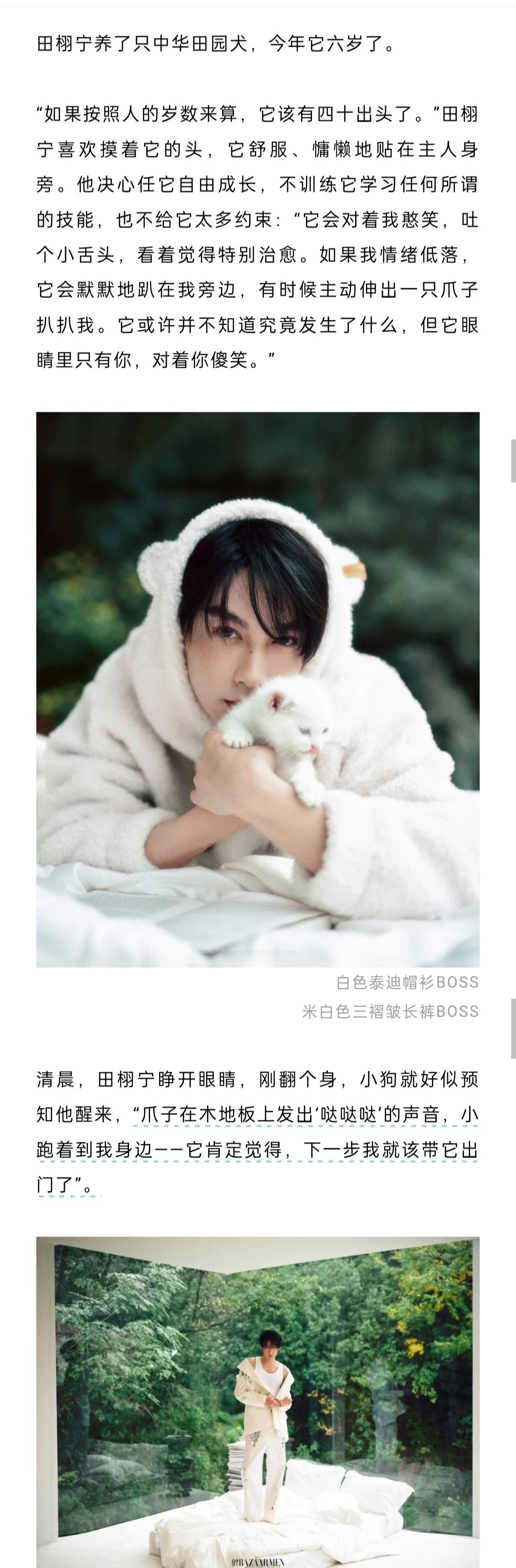 田栩宁《芭莎男士》封面人物文字采访🈶养了只中华田园犬,今年它六岁了。“如果我情绪低落,它会默默地趴在我旁边,有时候主动伸出一只爪子扒扒我。它或许并不知道究竟发生了什么,但它眼睛里只有你,对着你傻笑”解读《光焰》歌词——“其实,就在我最迷茫的时候,有一束光进来了,然后,我抓住了这束光,也迎来了更多的光。”“玩赛车让我极度专注,把其他的一切都忘掉,只想完成当下的事情——人坐上车,发动,飞驰出去,根本不会想到别的,肾上腺素飙升,只有‘下个弯怎么过’。当人完全沉浸在一件事中,就可以抛开其他感觉,不开心或烦恼,全部都抛掉。”自己曾感到压力巨大,心情随评论而波动,“但如今我已走过那个阶段,我只要做好自己的事情就可以了——这是最重要的,把所有的能量都用在这件事情上”。对比刚入行的自己:“要学的东西更多,要更加完善自己,无论学识,还是表演……成为公众人物,需要给大家带去一些正能量、有价值的东西。”