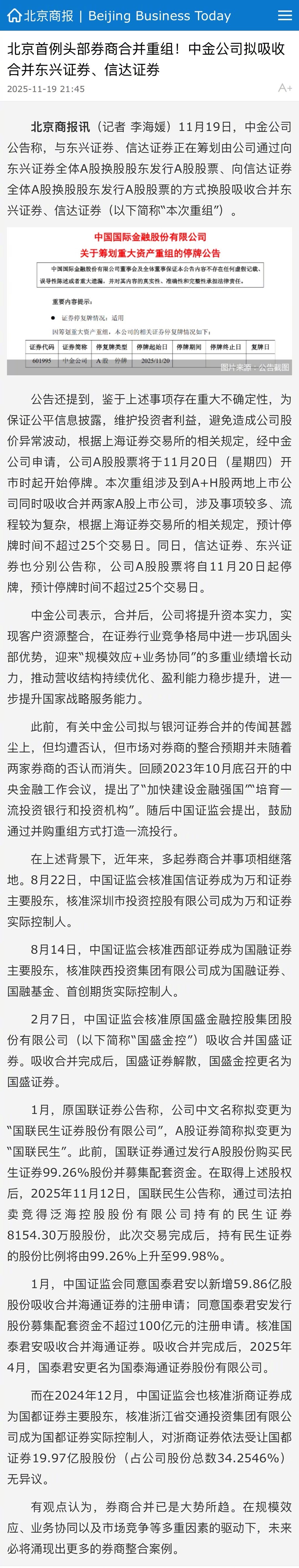 [#北京首例头部券商合并重组#!#中金拟吸收合并东兴证券信达证券#]11月19日,中金公司公告称,与东兴证券、信达证券正在筹划由公司通过向东兴证券全体A股换股股东发行A股股票、向信达证券全体A股换股股东发行A股股票的方式换股吸收合并东兴证券、信达证券(以下简称“本次重组”)。