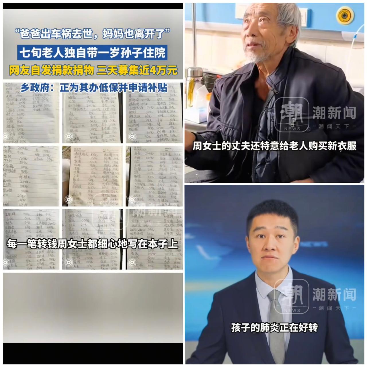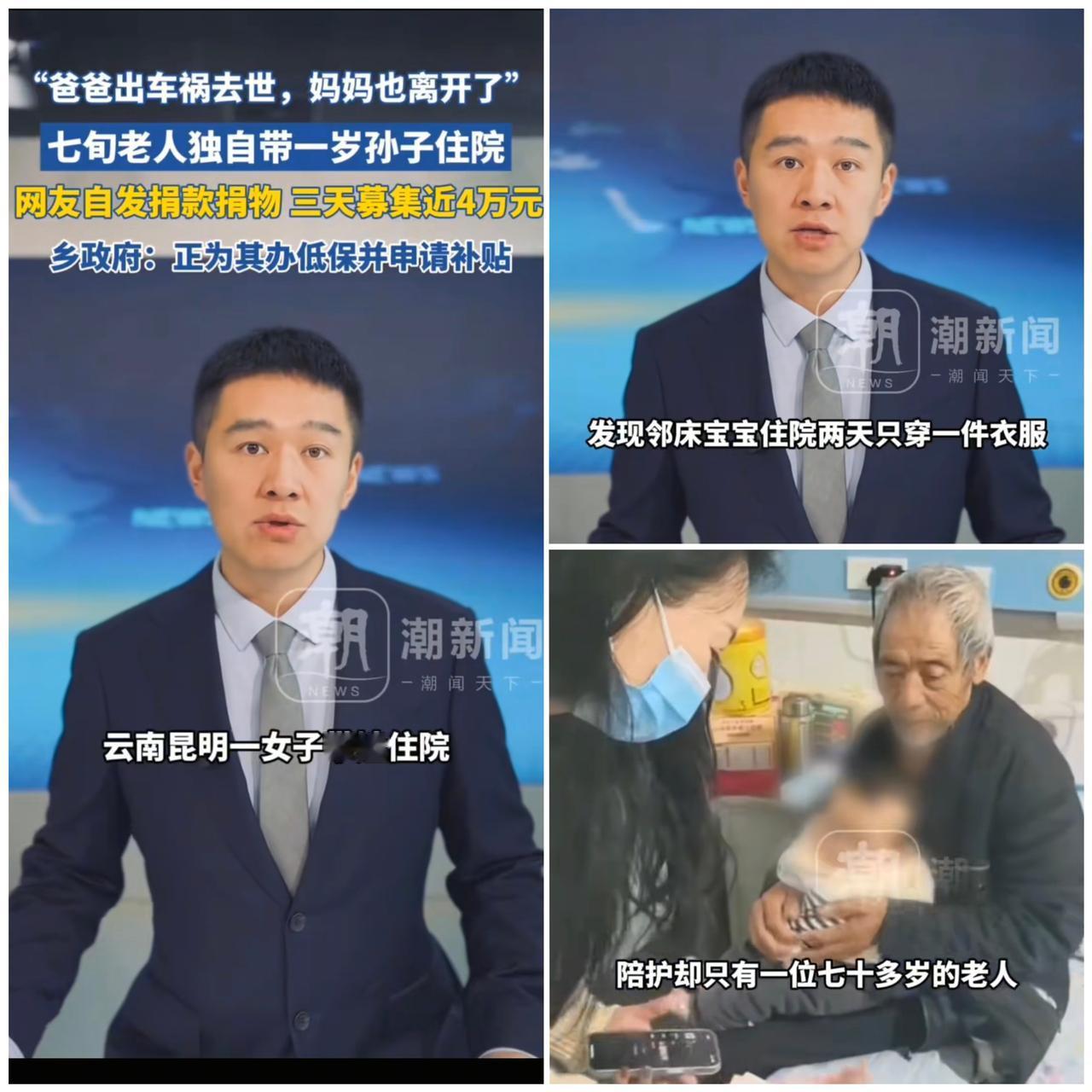 这世上总有一些瞬间,能瞬间击穿你所有的防备。 在云南昆明的一家县医院里,一位74岁的爷爷守在一岁孙子的病床前,那双布满老茧的手小心翼翼地给孩子喂水。 同病房的周女士观察了好几天,发现老人每顿只啃馒头配咸菜,晚上就蜷在走廊长椅上过夜。 当她忍不住询问孩子父母去向时,老人的回答让整个病房陷入了沉默——孩子的父亲因车祸去世,母亲随后失联,留下祖孙二人相依为命。 这场看似平凡的遭遇,却在周女士拍下视频的那一刻发生了转折。视频里,好奇把玩输液管的孩子和满头白发的爷爷触动了无数人的心弦。 短短48小时内,从几十元到几百元,从婴儿衣物到进口奶粉,爱心如潮水般涌来。 更令人感动的是,当地政府迅速介入,为这个家庭办理了低保和专项补贴,确保孩子未来的生活和教育有了保障。 在这场爱心接力中,我们看到了陌生人之间最纯粹的情感连接。那些连名字都不曾留下的网友,用一笔笔转账、一件件衣物,为这个濒临绝望的家庭重新点燃了希望。 而周女士和志愿者周姐的行动证明,在这个看似冷漠的世界里,善良从未缺席。它可能隐藏在日常生活的角落里,但一旦被唤醒,就能汇聚成改变命运的力量。 当我们为这对祖孙的遭遇揪心时,也不禁思考:在我们的身边,是否也有这样需要帮助的人? 或许他们不善表达,或许他们羞于求助,但只要我们愿意多看一眼、多问一句,就能成为别人生命中的那束光。 你曾经遇见过这样令人动容的陌生人之间的温暖吗?欢迎在评论区分享你的见闻。