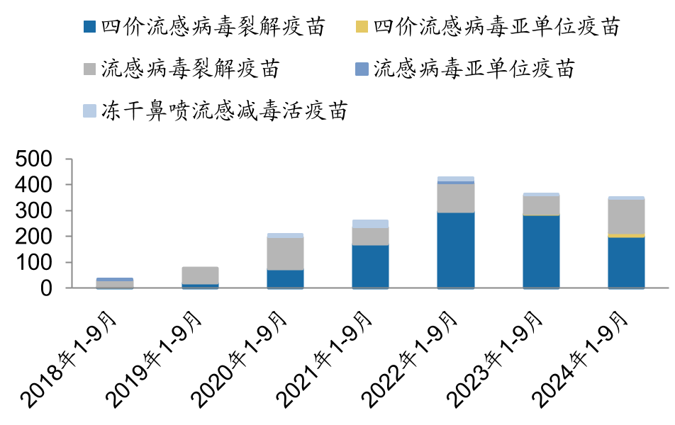 从以上签发量来看,2024年前9个月,四价流感病毒裂解疫苗的签发量显著低于2022年和2023年。然而,2025年前9个月的签发量已呈现上升趋势;截至该时段末,流感疫苗共计签发368批次,涵盖4个品类:冻干鼻喷流感减毒苗、流感裂解苗(三价苗)、四价流感裂解苗(四价苗)和四价流感亚单位苗。