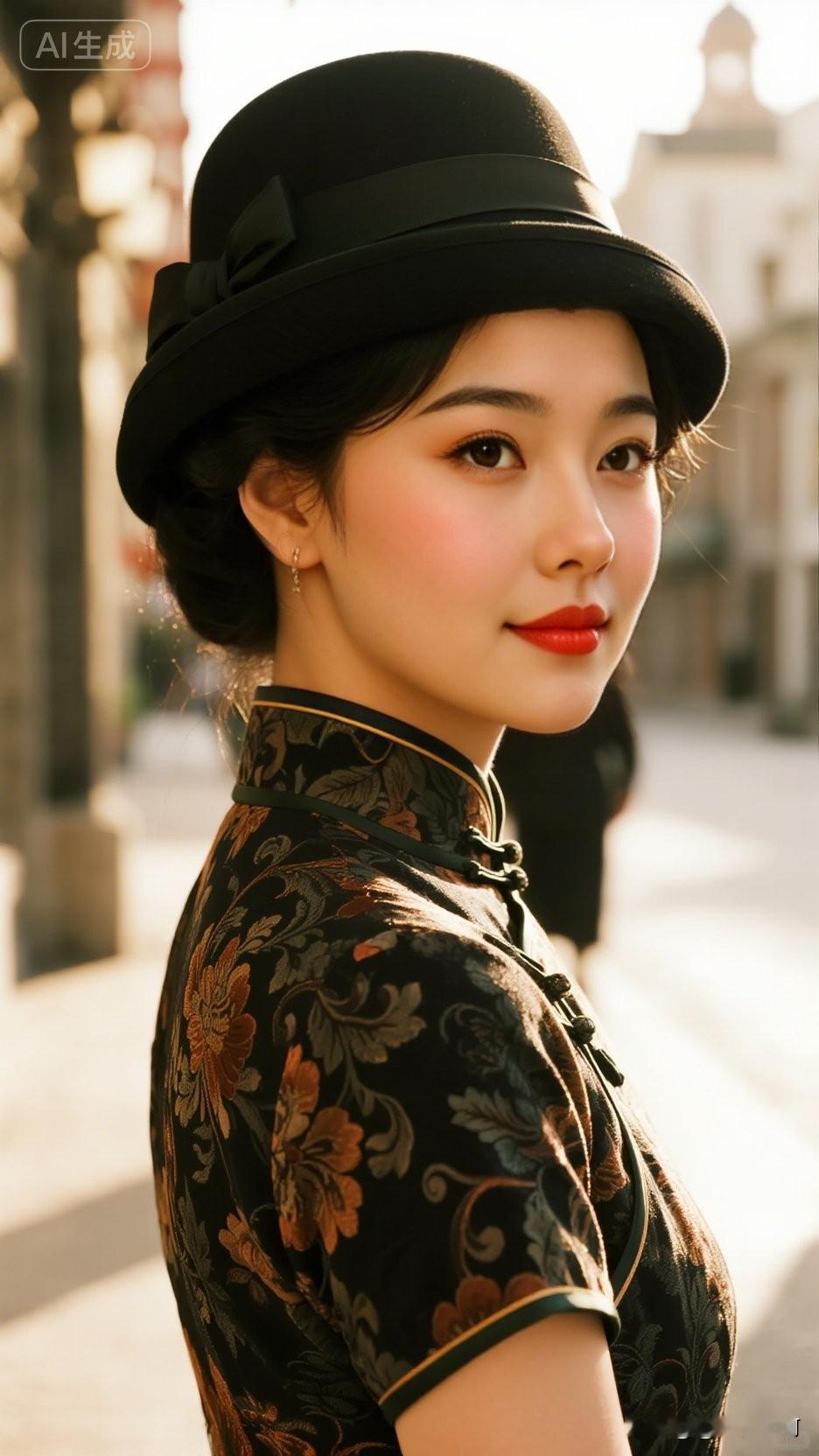 她身着墨色旗袍静坐。立领盘扣间,是东方气韵的端庄;半透纱袖下,锁骨线条若隐若现。