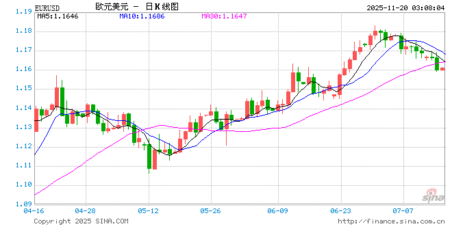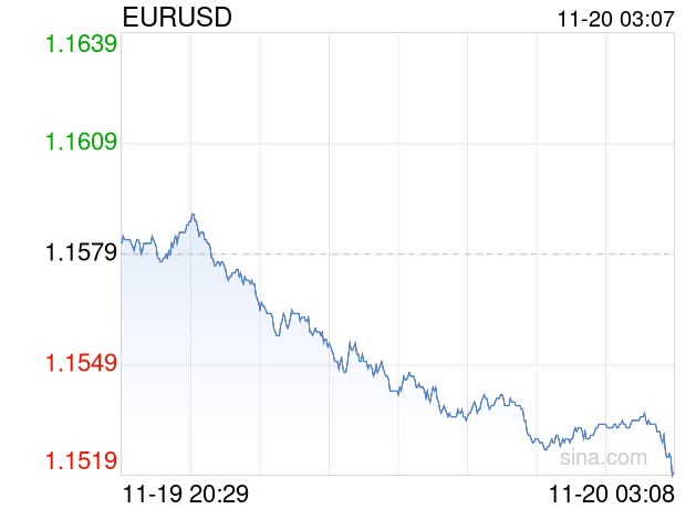 新浪外汇消息2025年11月20日,截至03时07分,外汇市场上欧元兑美元汇率跌破1欧元兑换1.1519美元。跌幅为-0.5182%