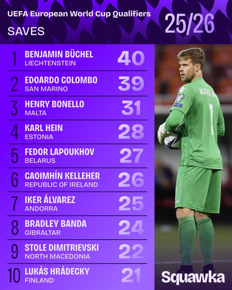 直播吧11月20日讯Squawka统计世欧预各队门将扑救次数,列支敦士登门将本杰明·布歇尔40次居首。