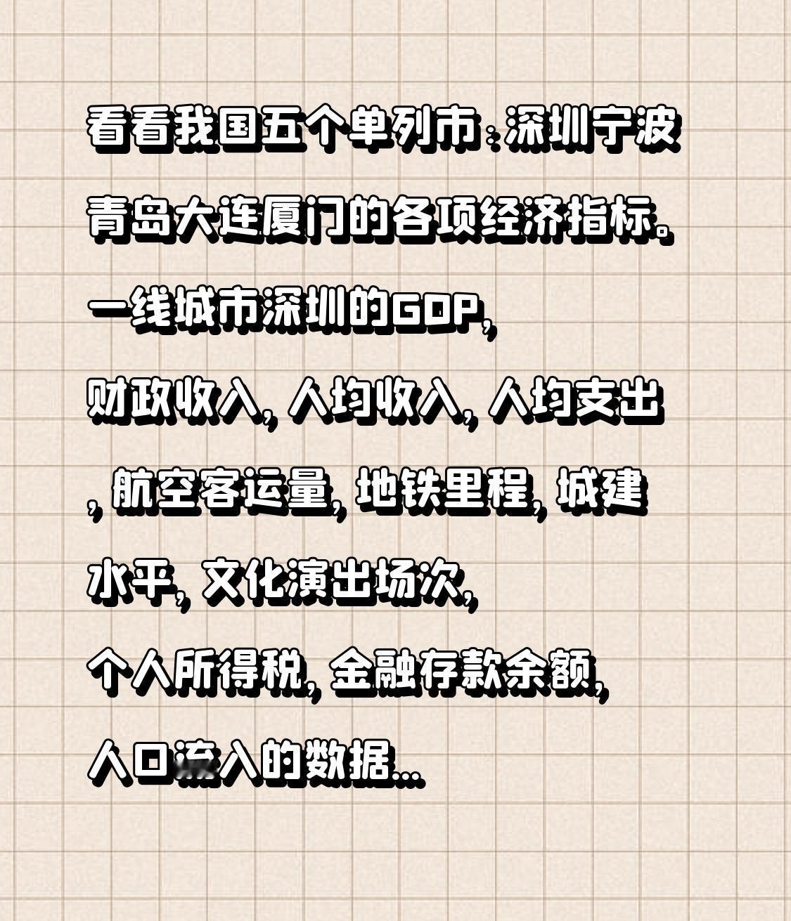 来看看,我国五个计划单列市——深圳、宁波、青岛、大连、厦门的各项经济数据。 身为一线城市,深圳在GDP、财政收入、人均收入、人均支出、航空客运量、地铁里程、城建水平、文化演出场次、个人所得税、金融存款余额、人口流入等数据方面,均遥遥领先。 在这五个计划单列市中,似乎唯有深圳是没有农村、没有农民的城市! 一市堪比一省,广东有深圳,广东经济一路高歌猛进,以此发展下去,广东还能称霸我国经济榜首数十年,也并非是完全不可能的事。