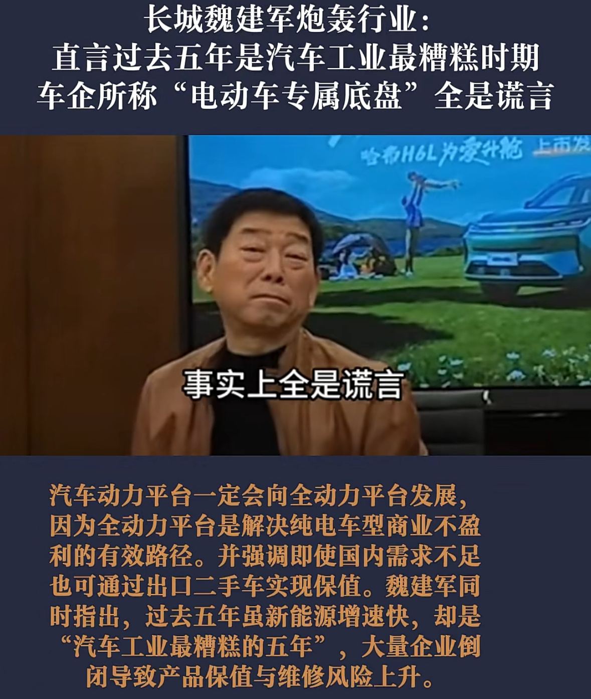 长城魏建军炮轰行业:直言过去五年是汽车工业最糟糕时期,车企所称“电动车专属底盘”全是谎言大家怎么看?老魏这个观点太犀利了。从个人或者说消费者角度,我完全赞同老魏这个说法但是从行业层面,甚至国家战略层面,到底怎么看这样的情况?