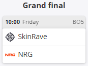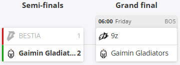 美洲区方面,南美决赛由9z对阵GaiminGladiators、北美决赛由NRG对阵SkinRave。
