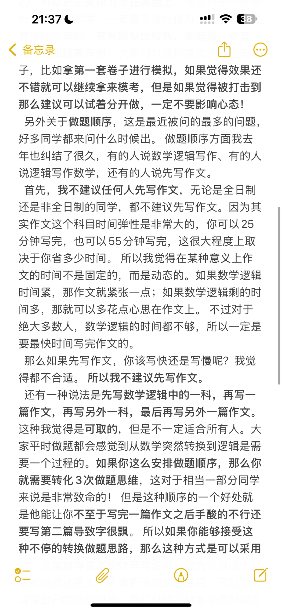 对于一些目标分数比较低,比如过国家线或者考MBA及非全的同学,我觉得这套卷子是可以不做的,可以把主要精力放在真题上。但是对于一些目标分数高的同学,一定要多进行模拟,这套卷子是有做的价值的,有些题型比较新,能起到一些查漏补缺和拔高作用。大家可以自行尝试一下这套卷子,比如拿第一套卷子进行模拟,如果觉得效果还不错就可以继续拿来模考,但是如果觉得被打击到那么建议可以试着分开做,一定不要影响心态!