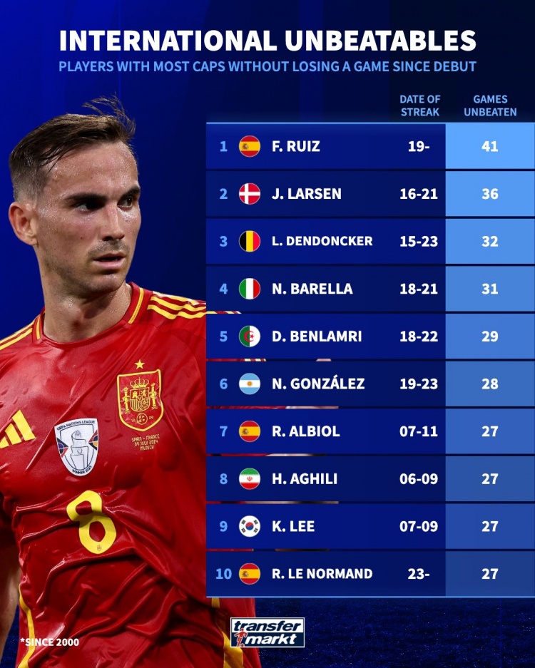 直播吧11月20日讯德国转会市场统计了本世纪球员在国家队的连续不败场次数据,并列出榜单,法比安·鲁伊斯连续41场不败居首。