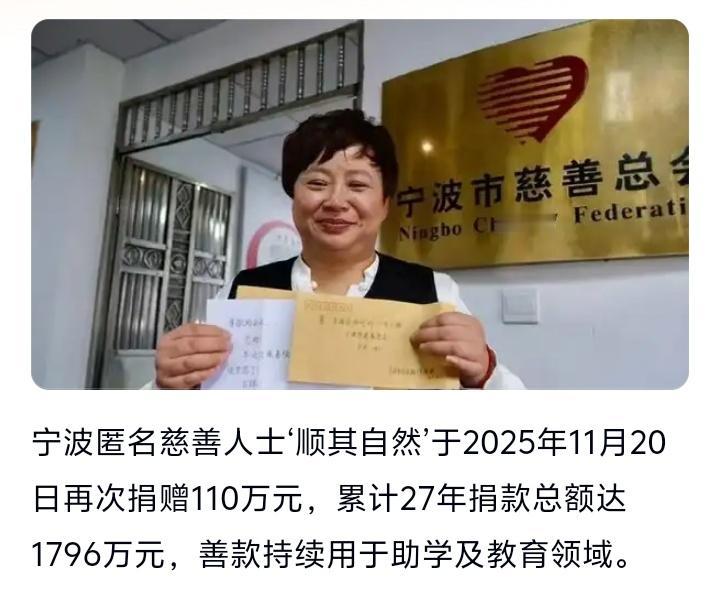 宁波神秘人“顺其自然”再捐110万!27年匿名捐赠1796万背后的真相让人泪目 (来源:综合宁波市慈善总会及网络平台热议) 当城市华灯初起,一份落款“其其”的汇款单悄然抵达宁波市慈善总会。110万元善款,没有联系方式,没有真实地址,只有熟悉的签名和一句“用于助学”。这是“顺其自然”的第27次捐款,27年累计1796万元。他像一阵风,吹散贫困学子的阴霾,却从未留下姓名。 有人说,这是当代“侠客”的传奇。一张张汇款单,化名从“顺顺”到“其顺”,地址永远虚构,金额永远不超过1万元——只为规避追踪。他像暗夜中的萤火,微弱却坚定地照亮无数寒门学子的前程。宁波慈善总会工作人员含泪说:“我们不知他是谁,但知道他在为谁拼命。” 为何执着匿名?或许《了凡四训》中“阴德天报之”道破天机。世人追逐名利时,他选择将善意埋进泥土。有网友感慨:“他捐的不是钱,是一颗滚烫的心。”更有人翻出受助者留言:“曾经的我因他圆了大学梦,如今也成了支教老师。”爱的循环,在此刻震耳欲聋。 然而争议随之而来。“为何不亲自捐助?”“善款明细敢公开吗?”质疑声中,一位老者犀利回应:“若他为避税,何必坚持27年?若他求名利,早该站在聚光灯下!”真相或许是:纯粹的灵魂,从不需要观众。 翻开受助学生的信笺,字句灼热。“谢谢‘顺其自然’叔叔阿姨,我会带着这份温暖走下去”“原来世界上真有无条件的爱”。这些眼泪与誓言,比任何账目更能证明善款的价值。宁波慈善总会坦言:“每分钱都用于助学,这是与他的默契。” 我们追问“他是谁”,不如思考“我们能成为谁”。当有人计较捐款抵税时,他默默汇出百万;当有人炒作慈善人设时,他隐身人海。有网友一针见血:“他让我们羞愧——自己还在计较得失,有人已奉献半生。” 这个时代不缺英雄,缺的是甘当无名之辈的英雄。从1999年到2025年,中国经济腾飞、网络更迭,唯一不变的是每年冬季那封汇款信。它像一声钟鸣,惊醒麻木的心灵:原来极致浪漫,是让世界变好却不留姓名。 若你问为何要相信光?请看那1796万元筑起的课堂、图书馆与梦想。最后,让我们用一位网友的留言作结:“虽不知你是谁,但谢谢你让我相信,平凡人也能成为别人的苍穹。” 宁波身边事