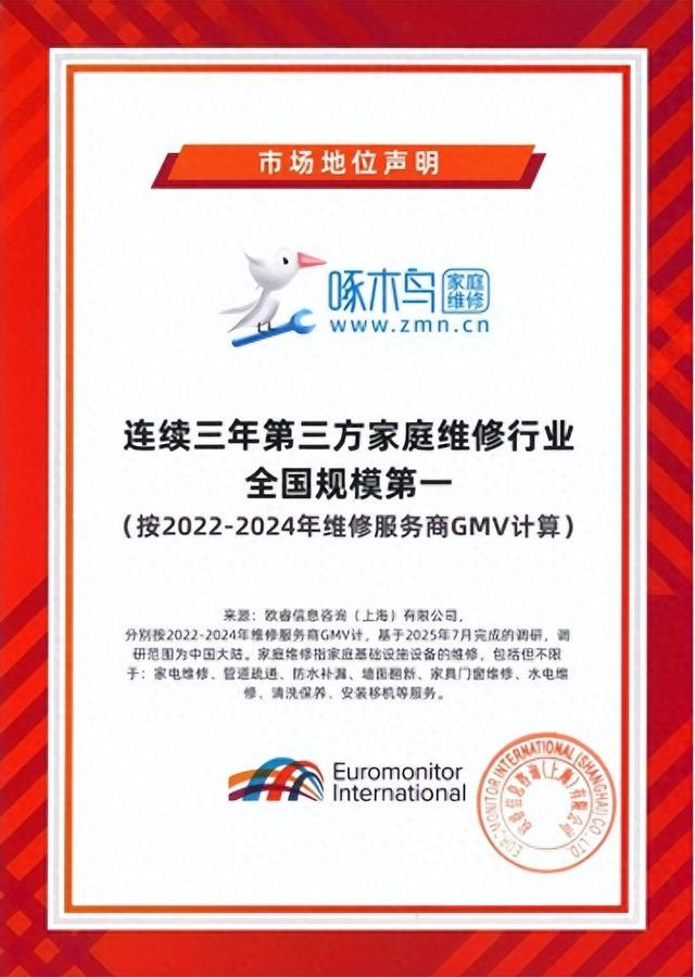 随着我国城镇化进程加速与居民生活水平提升,家庭维修行业已成长为规模可观的市场领域。数据显示,2023年中国家电保有量突破30亿台,且年增5%左右,叠加住房存量市场扩大,第三方家庭维修市场规模已超1600亿元。然而行业长期呈现“大行业、小企业”特征,市场集中度低、服务质量参差不齐,在此背景下,啄木鸟家庭维修凭借强劲实力,连续三年(2022-2024年)斩获第三方家庭维修行业全国规模第一(按GMV计算),为行业规范化发展注入强劲动力。