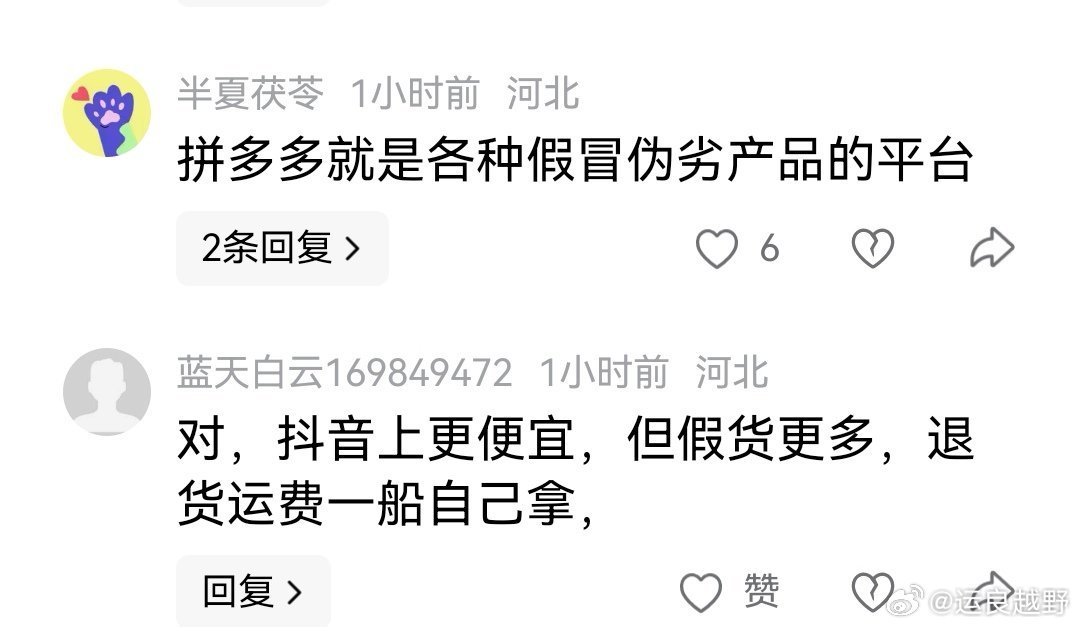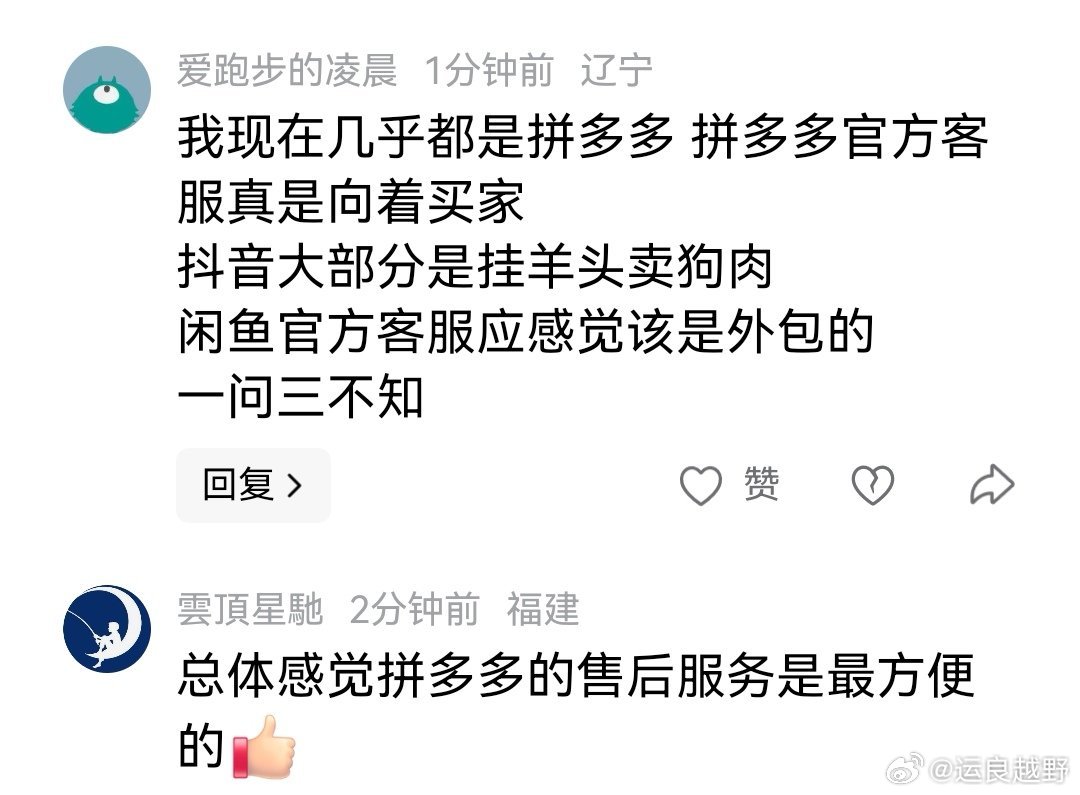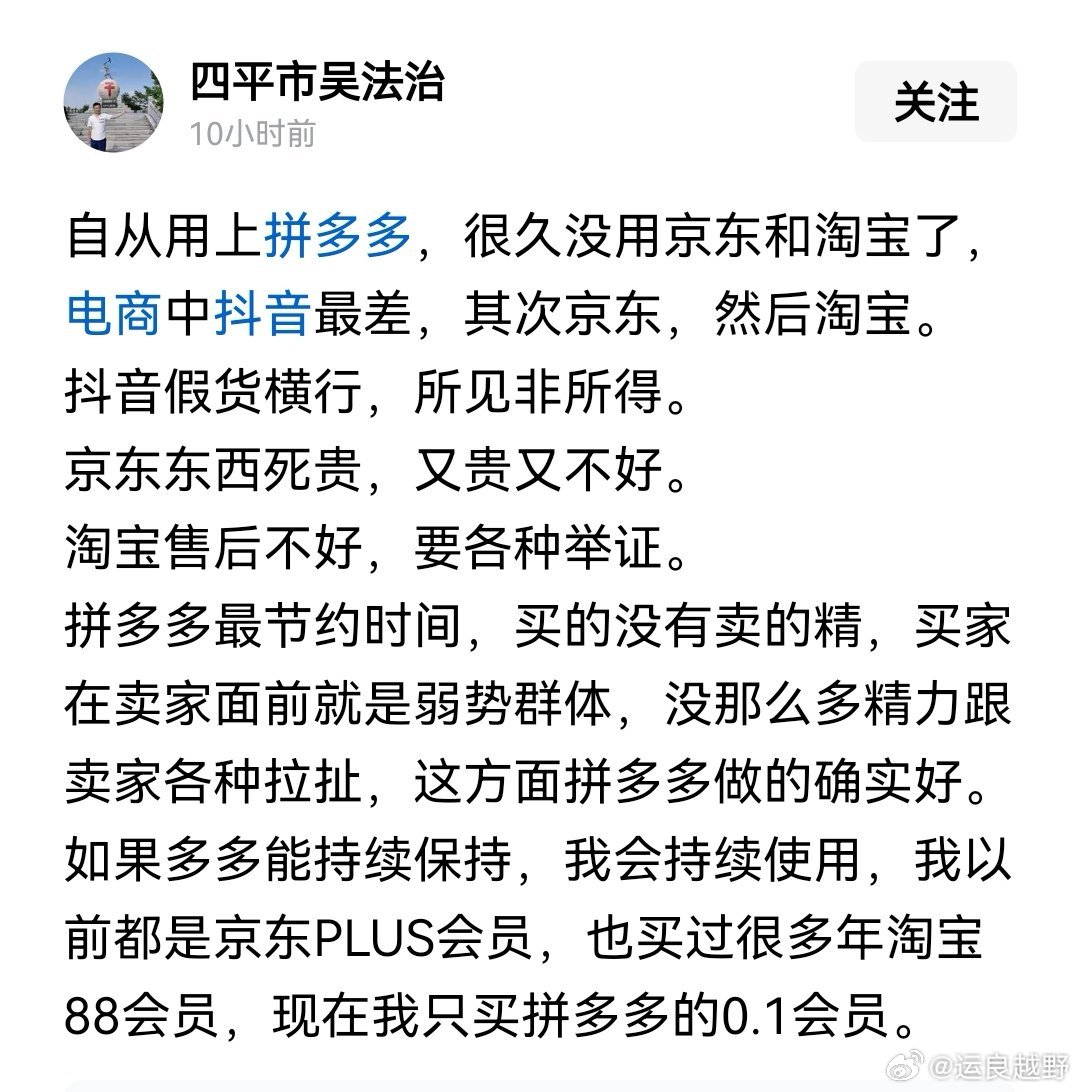 看了网上一些关于电商平台的讨论,挺有感触的。有人说拼多多售后省心、价格友好;也有人吐槽抖音假货横行、闲鱼客服形同虚设;更有人直接指出,一味追求低价的土壤,难免会滋生假冒伪劣。 在我看来,什么样的平台,就会滋养什么样的消费生态。就像一些人认知很低却在评论区自信的输出低智商的评论,还认为自己很强。当一个环境过度强调“最低价”而忽视品控,就容易让“挂羊头卖狗肉”和“刷评删差评”大行其道。懂的都知道去哪些平台买东西。