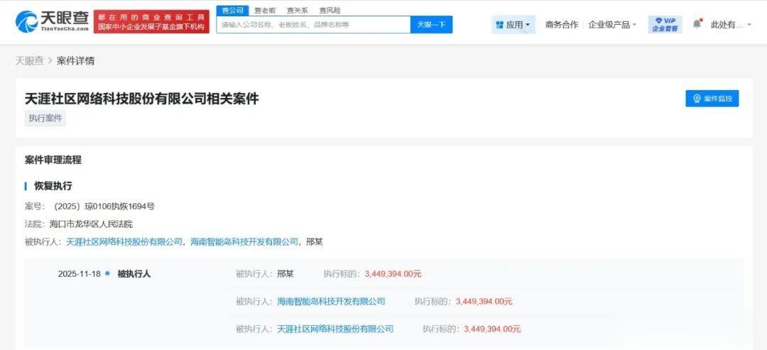 天眼查App显示,近日,天涯社区网络科技股份有限公司、海南智能岛科技开发有限公司、邢明新增一则恢复执行信息,执行标的344万余元,执行法院为海口市龙华区人民法院。