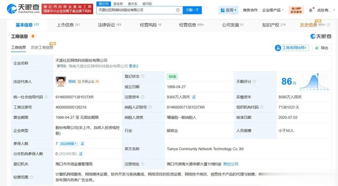 天涯社区网络科技股份有限公司成立于1999年4月,法定代表人、董事长兼总经理为邢明,注册资本9300万人民币,经营范围含计算机网络服务、网络媒体运营、软件开发与系统集成,网络项目的投资运营、网络技术培训,信息技术产品的代理与销售等。股东信息显示,该公司由邢明、达孜研悦管理咨询有限公司、江伟强等共同持股。