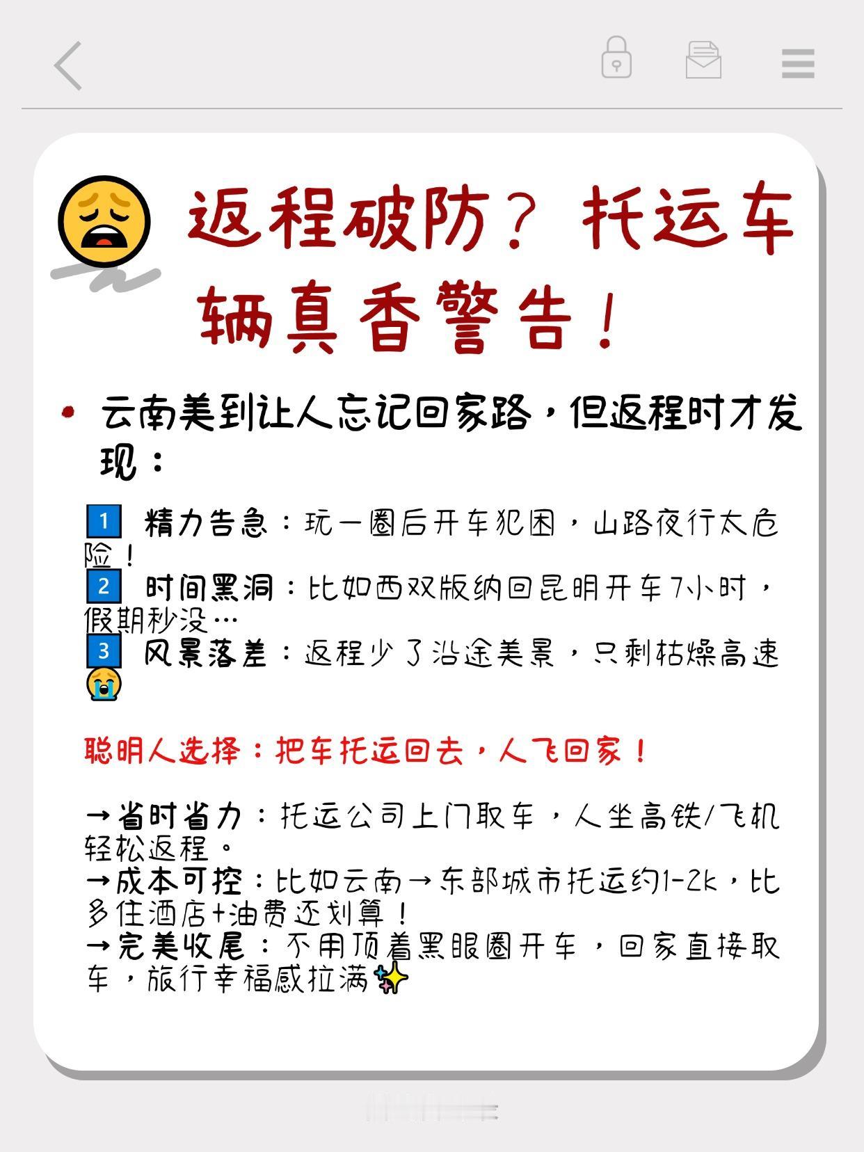 宝子们!听我一句劝!🙅♀️ 千万别!去!云南!自驾!🚗💨 因为……这里的景色真的太太太太太毒了!🌄🌿 四季如春的天气,雪山、洱海、热带雨林全挤在一个省,每天开车像在拍国家地理纪录片,结果就是——根本舍不得走! 🌟 懒人必存云南自驾线路 线路1:滇西北经典线(5-6天) •昆明→大理→丽江→香格里拉 •亮点:洱海骑行、丽江古城夜游、普达措国家公园 •Tips:香格里拉海拔高,注意防晒抗高反,沿途藏族风情超浓! 线路2:滇西南热带风情线(7天) •昆明→普洱→西双版纳 •亮点:景迈山古茶林、野象谷、星光夜市 •Tips:版纳摩托多,驾驶需小心,记得吃傣味手抓饭! 线路3:小众滇东南环线(10天+) •昆明→元阳梯田→建水→普者黑→弥勒 •亮点:元阳梯田日出、建水古城、普者黑荷花季(6-8月限定) •Tips:适合深度游,但时间短会累成狗! 😩 返程破防?托运车辆真香警告! 云南美到让人忘记回家路,但返程时才发现: 1️⃣ 精力告急:玩一圈后开车犯困,山路夜行太危险! 2️⃣ 时间黑洞:比如西双版纳回昆明开车7小时,假期秒没… 3️⃣ 风景落差:返程少了沿途美景,只剩枯燥高速😭 聪明人选择:把车托运回去,人飞回家! •省时省力:托运公司上门取车,人坐高铁/飞机轻松返程。 •成本可控:比如云南→东部城市托运约1-2k,比多住酒店+油费还划算! •完美收尾:不用顶着黑眼圈开车,回家直接取车,旅行幸福感拉满✨ 📌 自驾小贴士 •车辆选择:普通轿车可胜任,但SUV更适合探秘未开发村落。 •必带物品:防晒霜SPF50+、薄羽绒服(温差大)、氧气瓶(防高反)。 •预订预警:旺季民宿和玉龙雪山索道提前订!别学我差点睡车里。