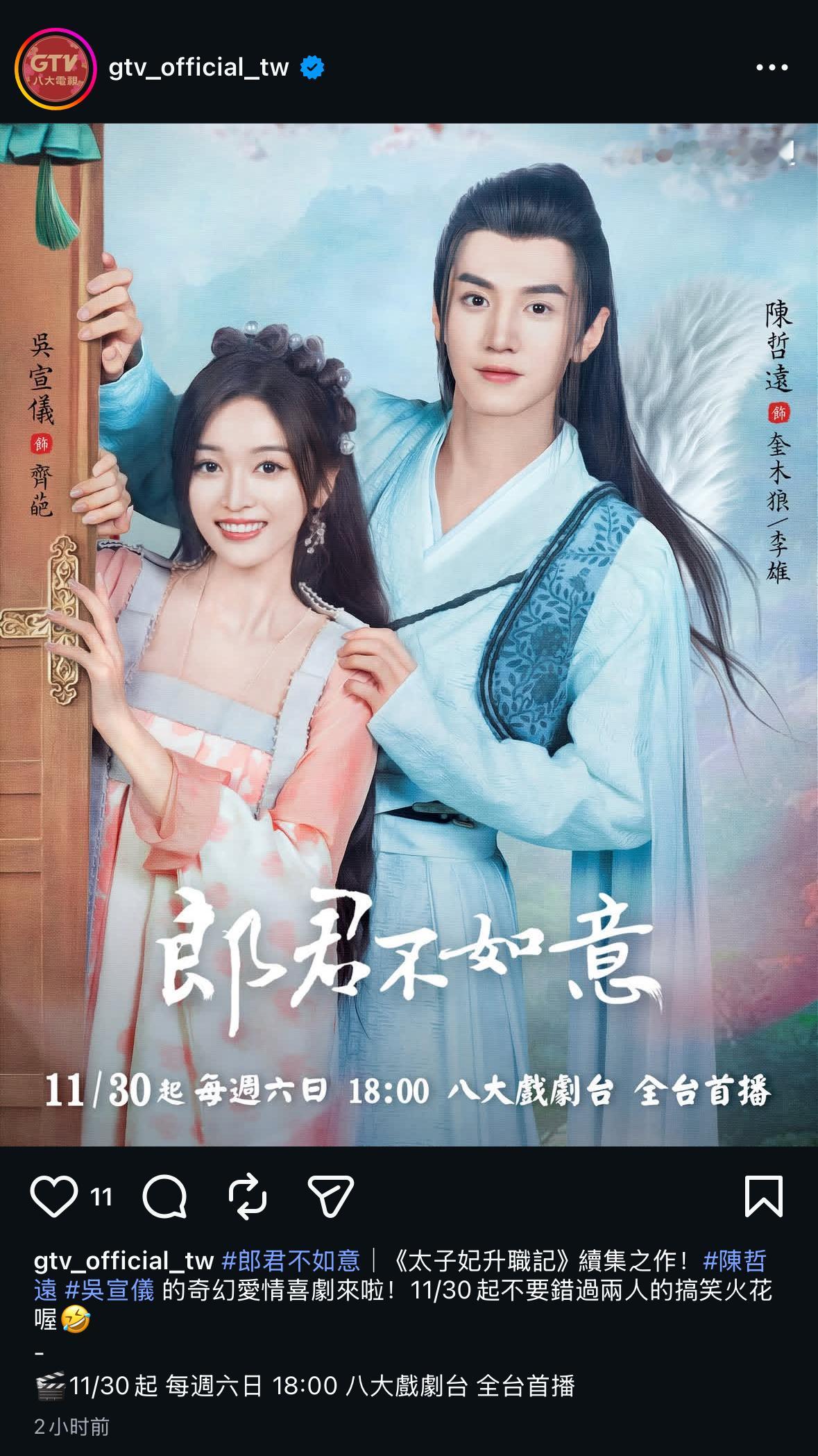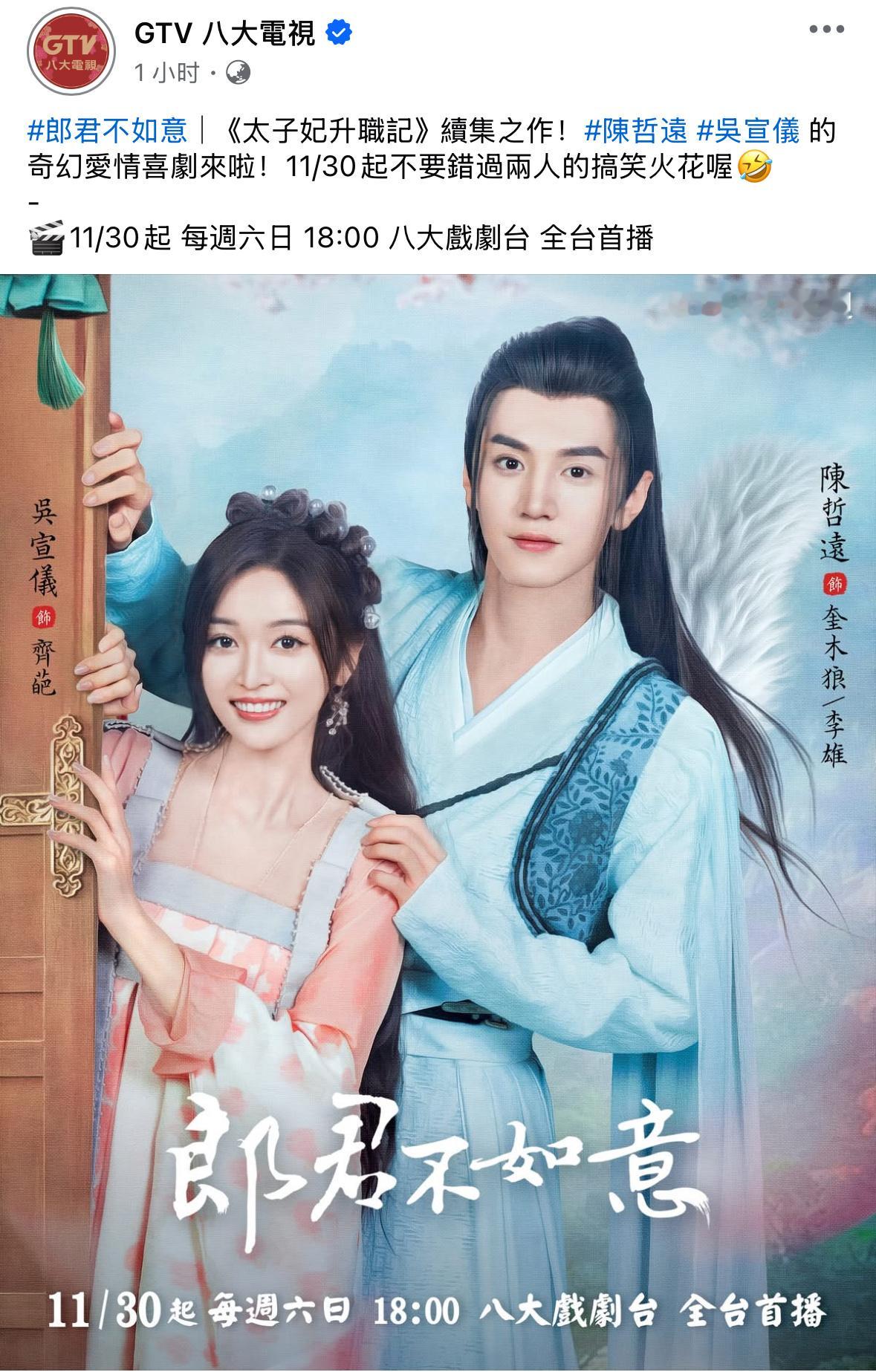 【台湾资讯: 】吴宣仪、陈哲远领衔主演的30集古装奇幻爱情喜剧《 》于11月30日台湾地区GTV八大电视八大戏剧台播出。