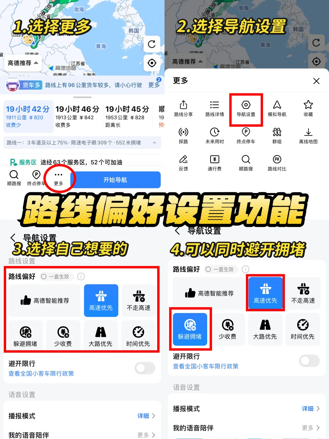 这时候导航就会给你设置更多的高速道路,还有避开拥堵、少收费、大路优先等很多功能
