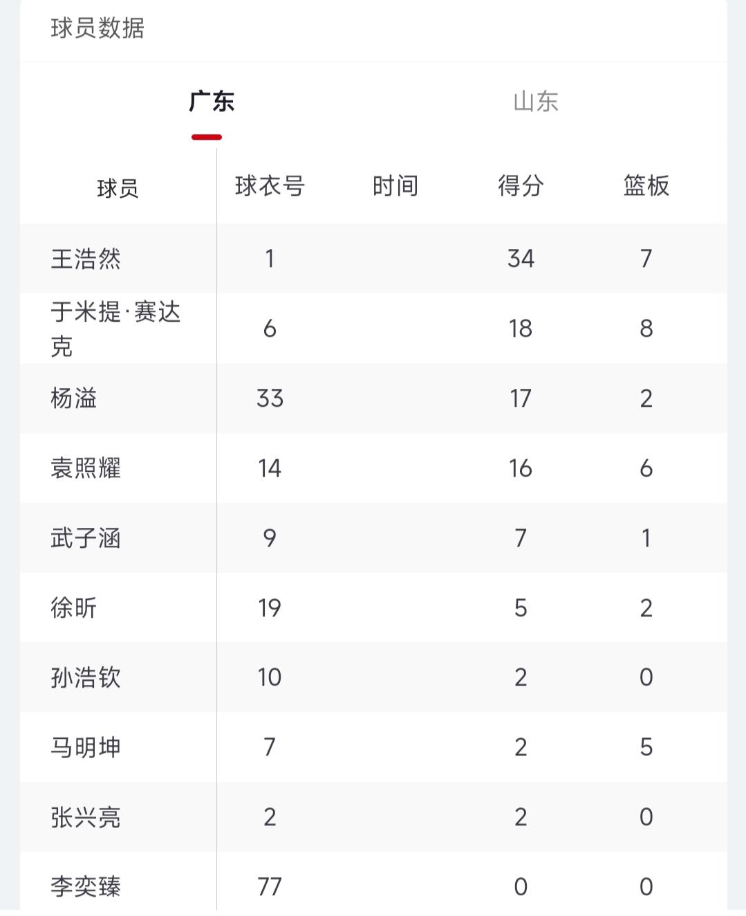 全运会U22男子篮球决赛,广东大胜山东获得冠军,感觉这场比赛不是一个级别的比赛,广东实力远强于山东,比赛也很早失去悬念!看看数据方面: 王浩然大杀四方砍下34分,赛达克也有18分进账,杨毅17分,袁照耀则有16分!而大番薯徐昕则仅仅拿下5分2篮板! 这次全运会徐昕表现不是很出色,原本潜力无限,但打U22还那么吃力,怪不得广东没有耐心继续培养了,只希望去到广州龙狮后能有更大的进步吧!