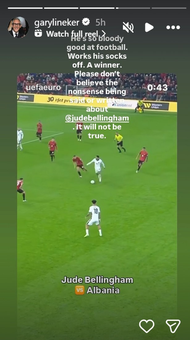 莱因克尔在他的Instagram故事中分享了欧足联官方欧洲杯账号展示的贝林厄姆对阵阿尔巴尼亚比赛精彩片段的帖子并写道:"他在足球领域实在太出色了。(在场上)拼尽全力。一个赢家。请别相信那些关于@贝林厄姆的胡说八道。那些都不是真的。"