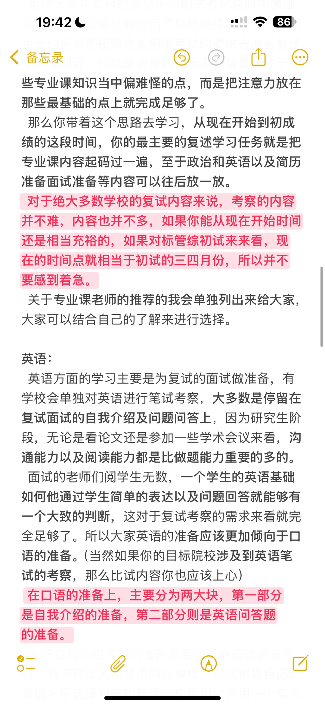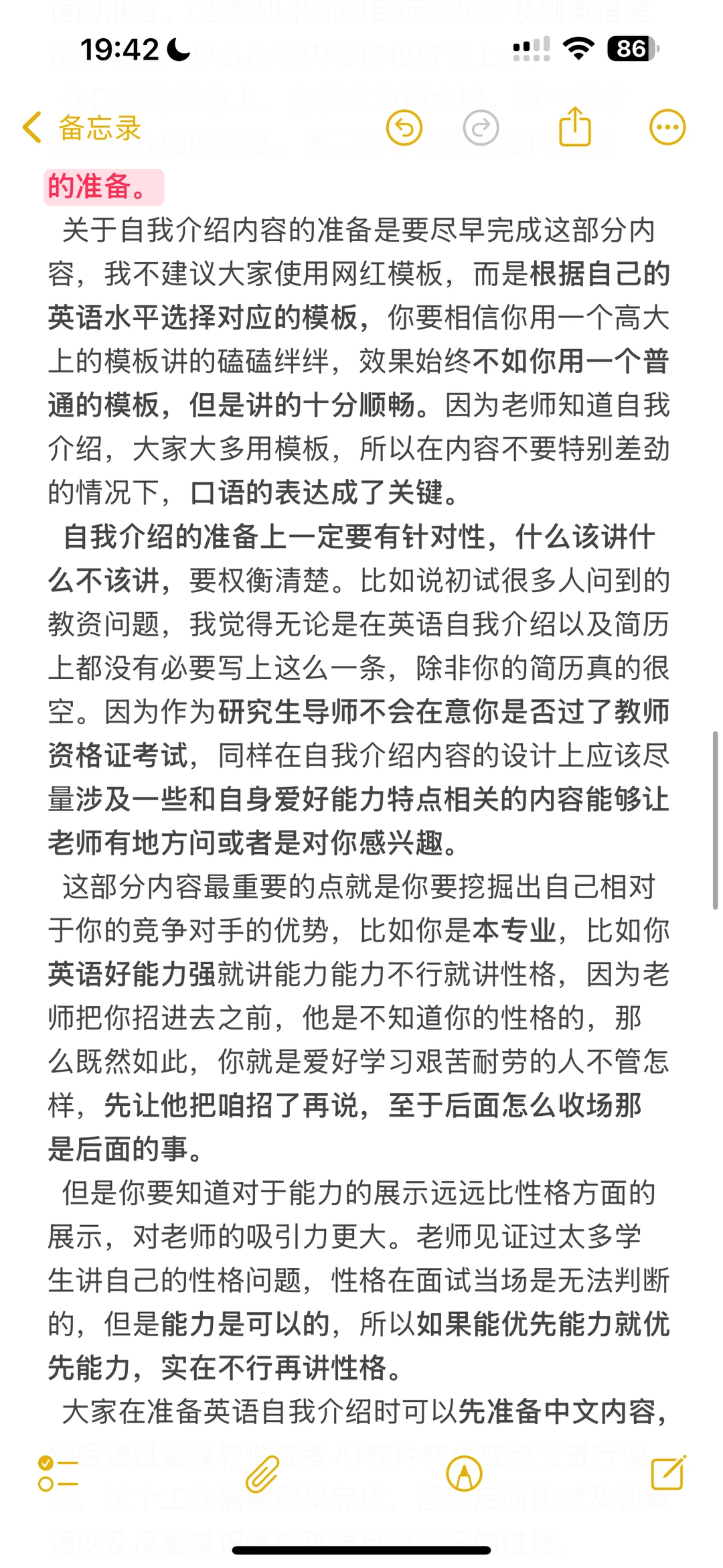 2️⃣英语:对于不考笔试的同学,重点在英语自我介绍和英语问答两方面。前期可以先把英语自我介绍的中文版整理出来,再不断打磨出英语版本。(口语不好的每天抽点时间练练口语)