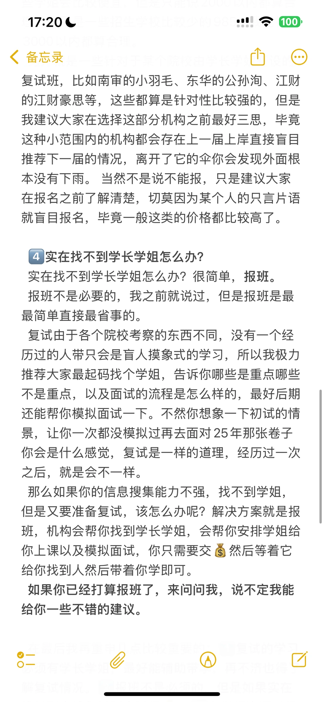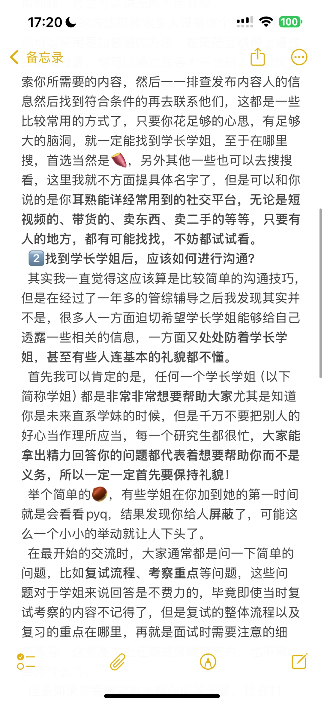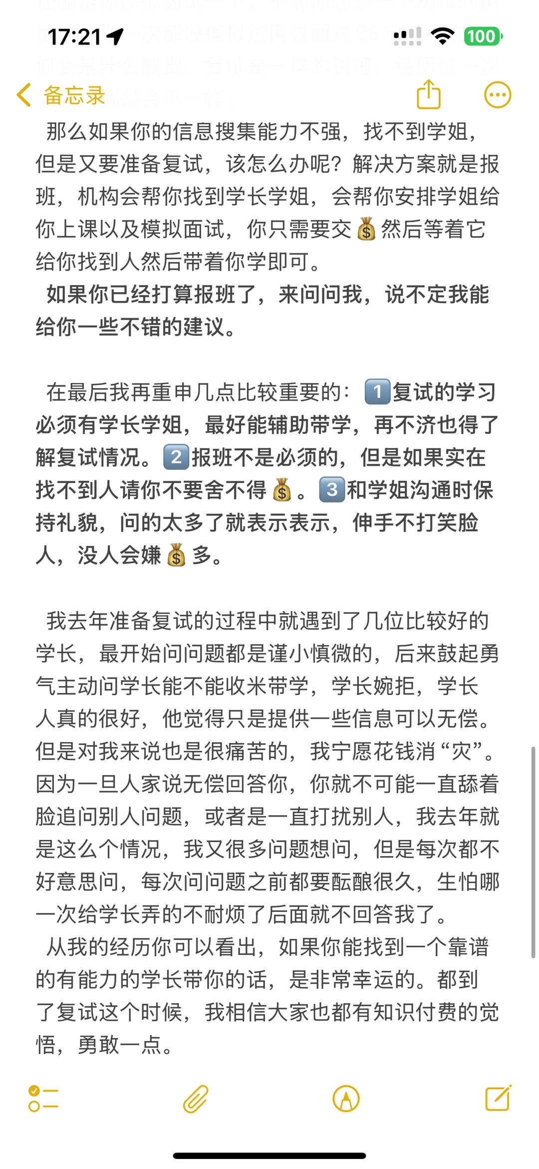 出一期内容告诉大家怎么样找到自己的学长学姐哈。 到了这个时候,大家都是要参加复试的人了,一定要有“知识付费”的概念,既然学长学姐帮你回答问题“服务”了你,那理应有所回答,这样才能促使他下一次更加用心。 关于如果找学长学姐我已经算是讲的比较详细,如果还是找不到的话就只能选择报机构让机构帮你找啦。 如果实在找不到学长学姐的可以来问我我可以帮忙找找或者推荐一下合适的机构哦。